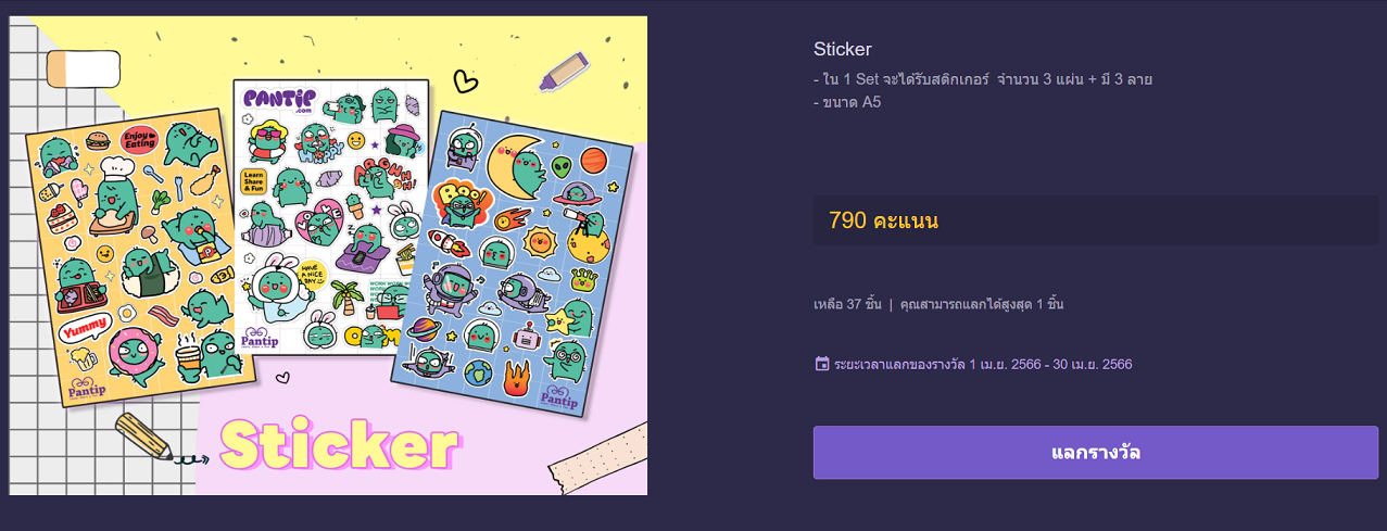 เฮ้อ ลุ้นพอยต์ ๑๑๑๑๑ อยู่ ทันใดนั้นPantip Pickก็เข้ามา พอยต์เกินไปเลย แต่ก็เอานะ ไม่ต้องดึงคืนกลับไป และให้Pantip Pickบ่อยๆก็ได้ ไม่ว่ากัน แลกตุ๊กตาน้องเพี้ยนยัมมี่ (ตัวใหญ่) เก็บไว้แจกสาวๆดีกว่า แลก