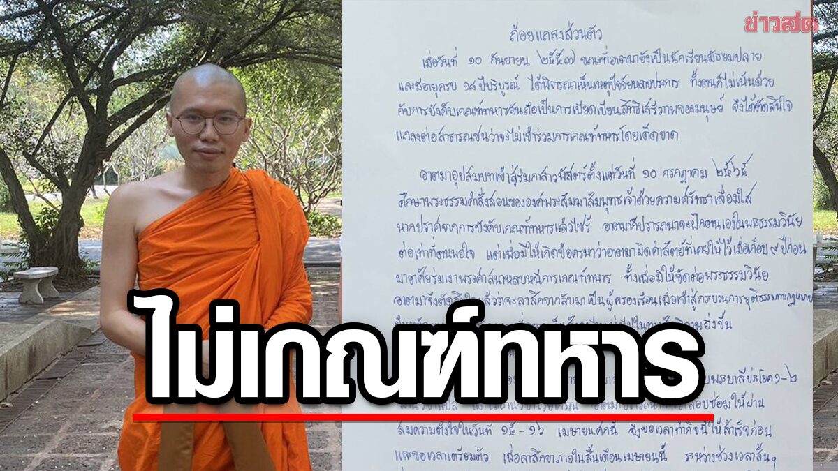 แถลงการณ์จาก "พระเนติวิทย์" ยืนยัน จะไม่เข้าร่วมกระบวนการเกณฑ์ทหารเด็ดขาด
