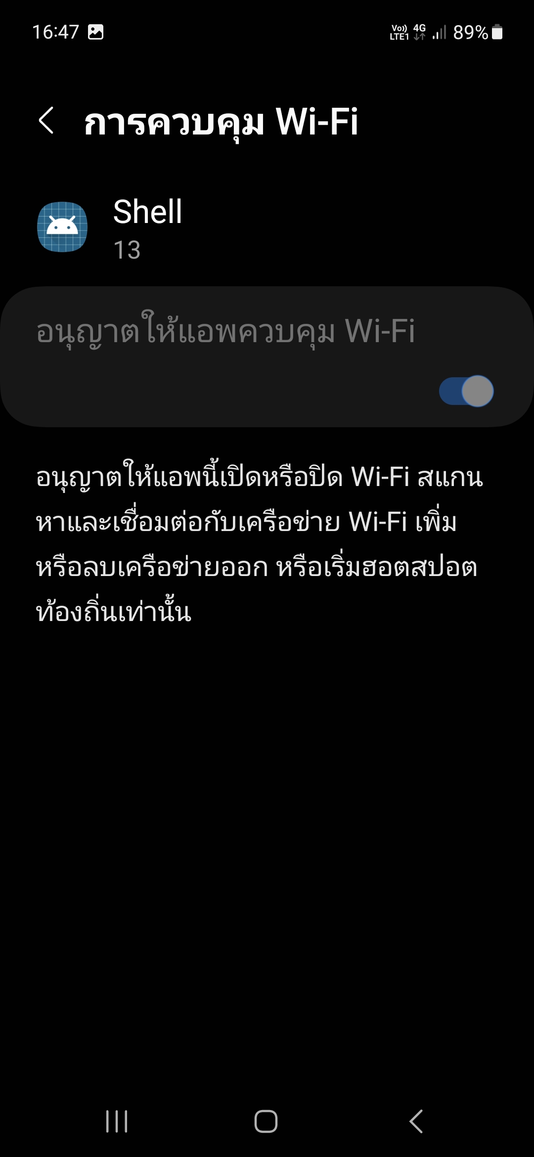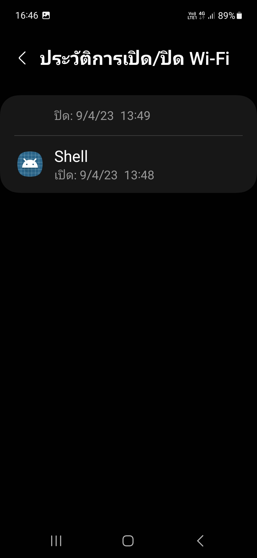จากนั้นออกมาจากศูนย์บริการ สังเกตว่าตรงแถบ notification ด้านบนซ้ายที่ใกล้ๆนาฬิกา มีสัญลักษณ์โชว์ขึ้นมาหน้าตาคล้ายไอคอนแปลกๆ หน้าตาคล้ายๆ สัญลักษณ์ wifi (ปกติถ้าเปิดใช้งาน wifi ไว้จะมี icon wifi ขึ้นทางด้านขวาบน แต่อันนี้ขึ้นด้านซ้ายบน) พอลากลงมาดูมันโชว์ว่าเป็นแอปชื่อ SHELL แต่พอจะจิ้มดูรายละเอียดมันก็หายไปแล้ว เลยลองค้นหาในเครื่องดู ปรากฎแอปนี้ในส่วนหัวข้อประวัติการเปิด/ปิด wifi ตามรุป ด้วยความที่ไม่รู้จักแอปนี้มาก่อน เกิดความสงสัยเลยเดินกลับไปศูนย์ ถามเจ้าหน้าที่ที่ศูนย์กลับบอกไม่รู้จัก ทั้งๆ ที่มันโชว์ขึ้นมาหลังจากเราออกจากศูนย์