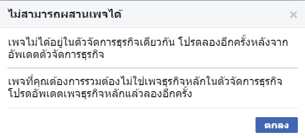 เราลองผสานเพจบน FB แต่ไม่สำเร็จ ระบบขึ้น (ตามรูป) เพื่อนๆมีวิธีแก้มั้ยคะ