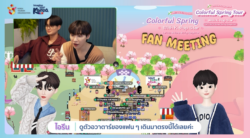 งานนี้ KTO Thailand ได้พาทุกคนไปร่วมท่องเที่ยวในประเทศเกาหลีในช่วงฤดูใบไม้ผลิของ 3 เมือง ไม่ว่าจะเป็นเมือง ปูซาน แทกู และชอลลานัมโด(มูอัน) ในโลก Metaverse ผ่านแอป Zepeto ตลอดเดือนมีนาคมที่ผ่านมาโดยมีไกด์อวาตาร์อย่าง 2 หนุ่ม แดฮวี และอุง มาร่วมสร้างสีสันยกกำลังสองด้วยการเป็นคนนำทริปเองเลย และปิดท้ายความพิเศษด้วยกิจกรรม Colorful Spring ‘Special Q&A’ with Daehwi and Woong AB6IX ในรูปแบบใหม่ผ่านโลก Metaverse อย่างเว็บไซต์ Gather town เมื่อวันอาทิตย์ที่ 2 เมษายนที่ผ่านมา โดยได้รับความสนใจจากแฟนๆ ชาวไทยจำนวนมากเข้าร่วมกิจกรรม Special Q&A กับแดฮวีและอุง จากวง AB6IX ซึ่งผู้ที่ได้เข้าร่วมกิจกรรมในครั้งนี้เป็นผู้ที่ได้เข้าร่วมกิจกรรม 'Finding K-Pop Star' และผ่านรอบตอบคำถามจาก Korea Colorful Quiz กับทาง KTO Thailand มาแล้วเท่านั้น ถือว่างานนี้จัดเต็ม และพิเศษมาก ๆ เลย สำหรับแฟนๆ ชาวไทยที่ได้เข้าร่วมกิจกรรมในบรรยากาศสุด Exclusive กับ แดฮวี และอุง