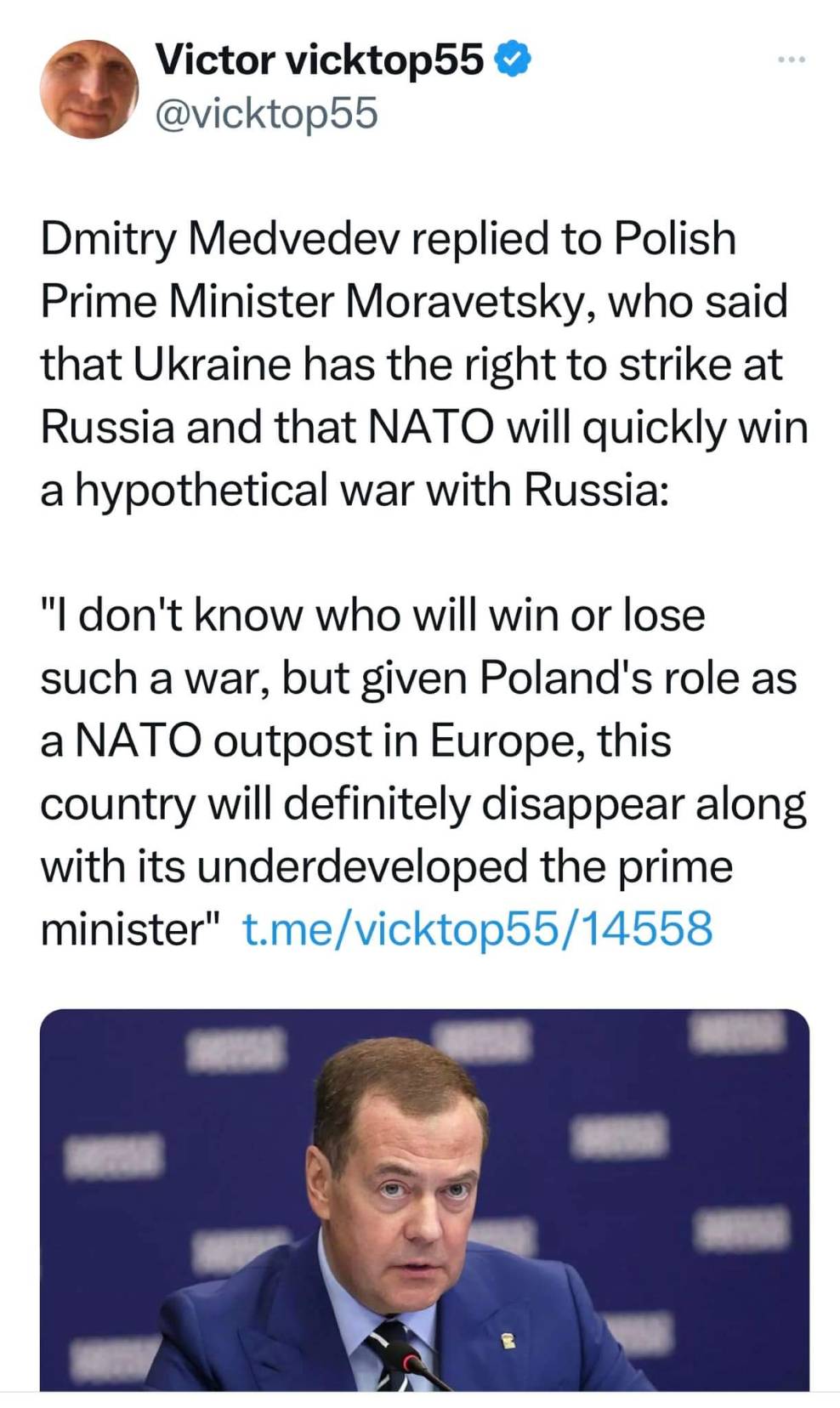 เมดเวย์เดฟ กล่าวโต้นายกฯโปแลนด์ ถ้าเกิดสงครามกับนาโต้ ด่านแรกคือประเทศโปแลนด์ จะหายสาบสูญแน่นอน