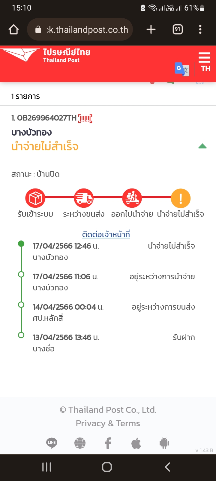 ขนส่งไปรษณีย์ไทย ems ขึ้นว่านำจ่ายไม่สำเร็จติดต่อผู้รับไม่ได้ทั้งๆที่ยังไม่โทรหาผมเลย