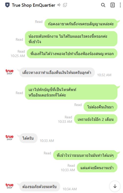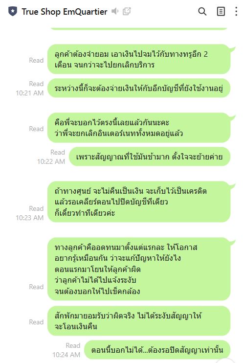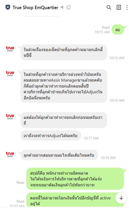 เมื่อถึงเวลาครบสัญญาปลายเดือนม.ค.66 ที่สามารถปิดบริการอินเตอร์เน็ทได้ ทางทรูได้มีการเรียกเก็บค่าใช้จ่ายส่วนต่างอีก 251.11บาท จึงได้แย้งไปว่า ในระบบมีเงินเกินอยู่ สามารถตัดจากเงินจำนวนนั้นได้เลย แต่พนักงานก็แจ้งว่าไม่ได้ ถ้าจะปิดบัญชี ต้องจ่ายเงินเข้าไปปิดเท่านั้น