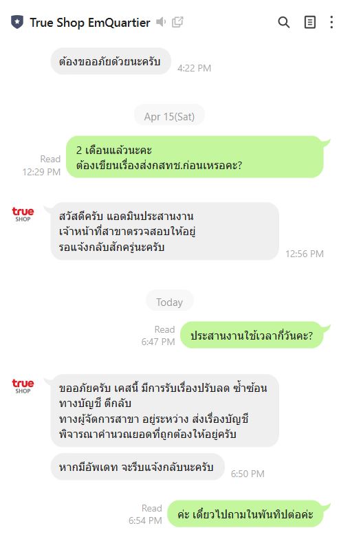 จนถึงตอนนี้ 19เมษา ครบรอบ 6 เดือนที่เอาเงินไปจมไว้กับทรูรอบแรก และ 2 เดือนที่เอาเงินไปจมรอบ 2 แต่ทางทรูชอปเอมควอเทียร์ตอบมาได้แค่จะติดตามให้ ทุกรอบจะต้องสอบถามไปตลอด