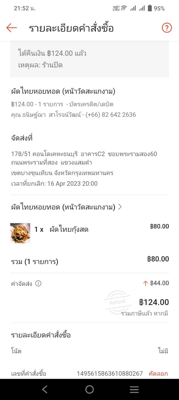 สั่งอาหารผ่านแอพสีส้ม รายการถูกยกเลิก แต่ยังไม่ได้เงินคืนเข้าบัตรเครดิต