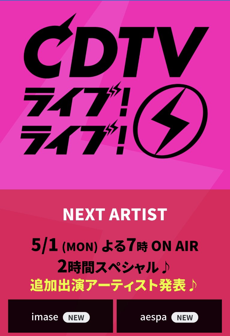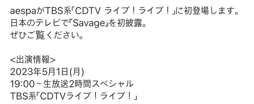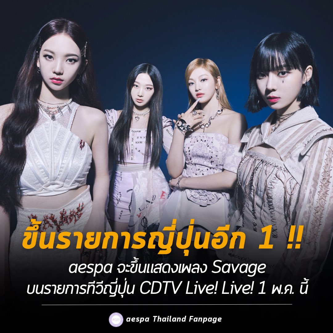 aespa ปรากฏตัวครั้งแรกในรายการ "CDTV Live! Live!" ช่อง TBS การเปิดตัว "Savage" ทางโทรทัศน์ญี่ปุ่นเป็นครั้งแรกโปรดติดตามชม <ข้อมูลการแสดง> จันทร์ที่ 1 พฤษภาคม พ.ศ. 2566 เวลา 19:00 น. (ญี่ปุ่น) 17.00 น. (ไทย) ซึ่งเป็นการออกอากาศพิเศษ 2 ชั่วโมง