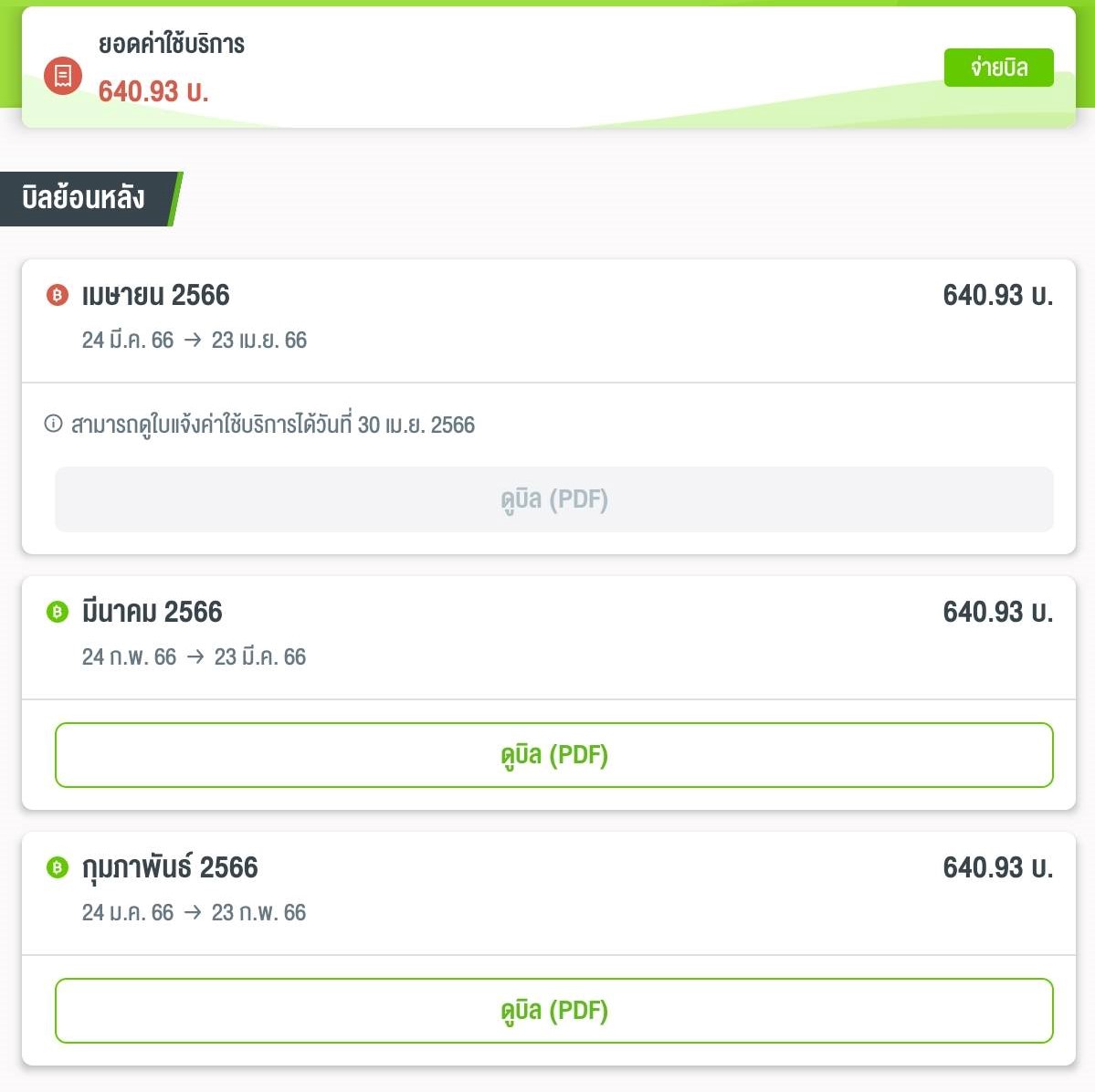 เดือน 2 (มี.ค.) จ่ายไป 85.99 บาท (พอมาถึงตรงนี้ก็งงอีกว่าค่าอะไร ไหนตอนแรกบอกว่าฟรี ??? แต่พอดูดีๆ ลองเอา 640.93+85.99=726.92 ใกล้เคียงกับค่าเน็ต AIS fibre ต่อแรก เลยไม่คิดอะไร นึกว่าเป็นค่าใช้จ่ายอันเดิมกัน แต่แยกกันจ่าย)