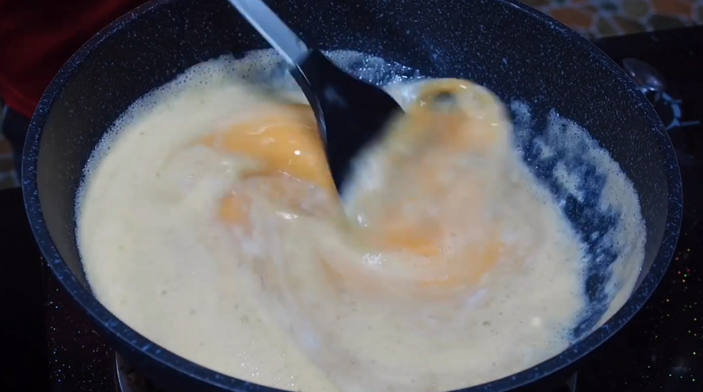 นำไข่ที่ตีไว้มาใส่ลงไป แล้วคนให้เข้ากัน