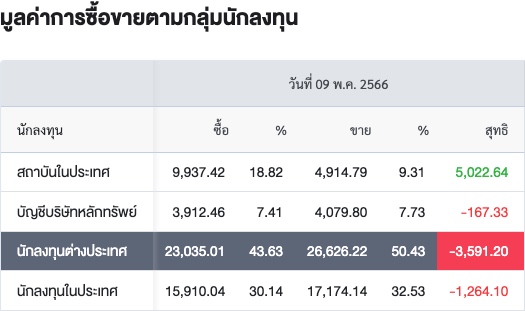 Sinthorn Summary 9/5/2566 : ต่างชาติขายสุทธิ -3,591.20 ลบ.