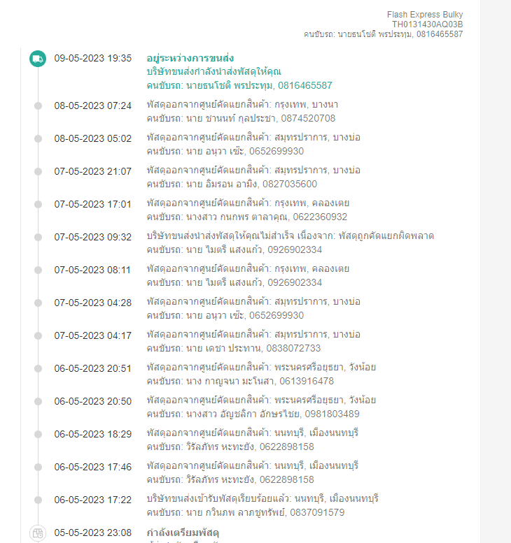 สั่งของจากร้านในTiktok ร้านส่งของไวมาก ของมาถึงสาขาปลายทาง-บางซื่อ ช่วงเช้าวันที่23 จนตอนนี้เย็นวันที่27 ยังไม่มีการส่งของใดๆ สถานะไม่ขยับ มีการติดตามและเร่งจัดส่งไปยังแอพของแฟลชแล้วแต่ก็ไม่คืบหน้า ขน