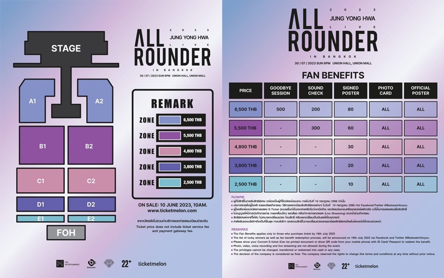 “2023 JUNG YONG HWA LIVE 'ALL-ROUNDER' IN BANGKOK” วันอาทิตย์ที่ 30 กรกฎาคม 2566 เวลา 6 โมงเย็น ณ ยูเนี่ยนฮอลล์ เปิดจำหน่ายบัตร : วันเสาร์ที่ 10 มิถุนายน 2566 ตั้งแต่เวลา 10.00 น. เป็นต้นไป ทางเว็บไซต์ www.ticketmelon.com บัตรราคา 6,500 / 5,500 /4,800 / 3,800 และ 2,500 บาท