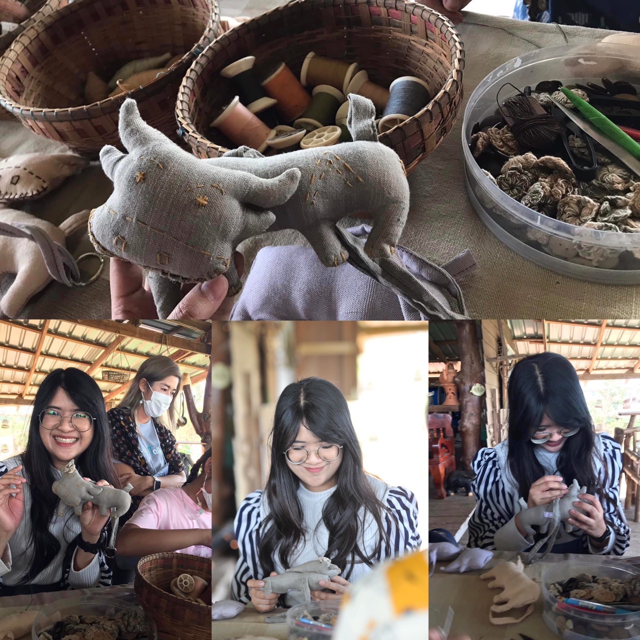 โดยน้องควายธนู จะทำจากผ้าหลากสีเลยนะคะ โดยสีที่ใช้ย้อมผ้า ก็จะมาจากธรรมชาติทั้งสิ้น อย่างสีน้องควายธนูของเราตัวนี้ ย้อมจากมูลควาย ซึ่งเป็นสี signature ของที่นี่เลยค่ะ ซึ่งตุ๊กตาควายธนูตัวนี้เป็นการผสมผสานระหว่างความเชื่อเรื่องควายธนูของคนในสมัยก่อน ผ่านการนำเสนอในรูปแบบใหม่ให้ดูน่ารัก เรียกได้ว่าได้ทั้งของที่ระลึกและความภูมิใจในชิ้นงานของเราด้วยค่ะ เย็บผ้าไม่ค่อยจะเป็น ทุลักทุเลสุดๆ ได้แม่ๆมาช่วยสอนด้วยค่ะ