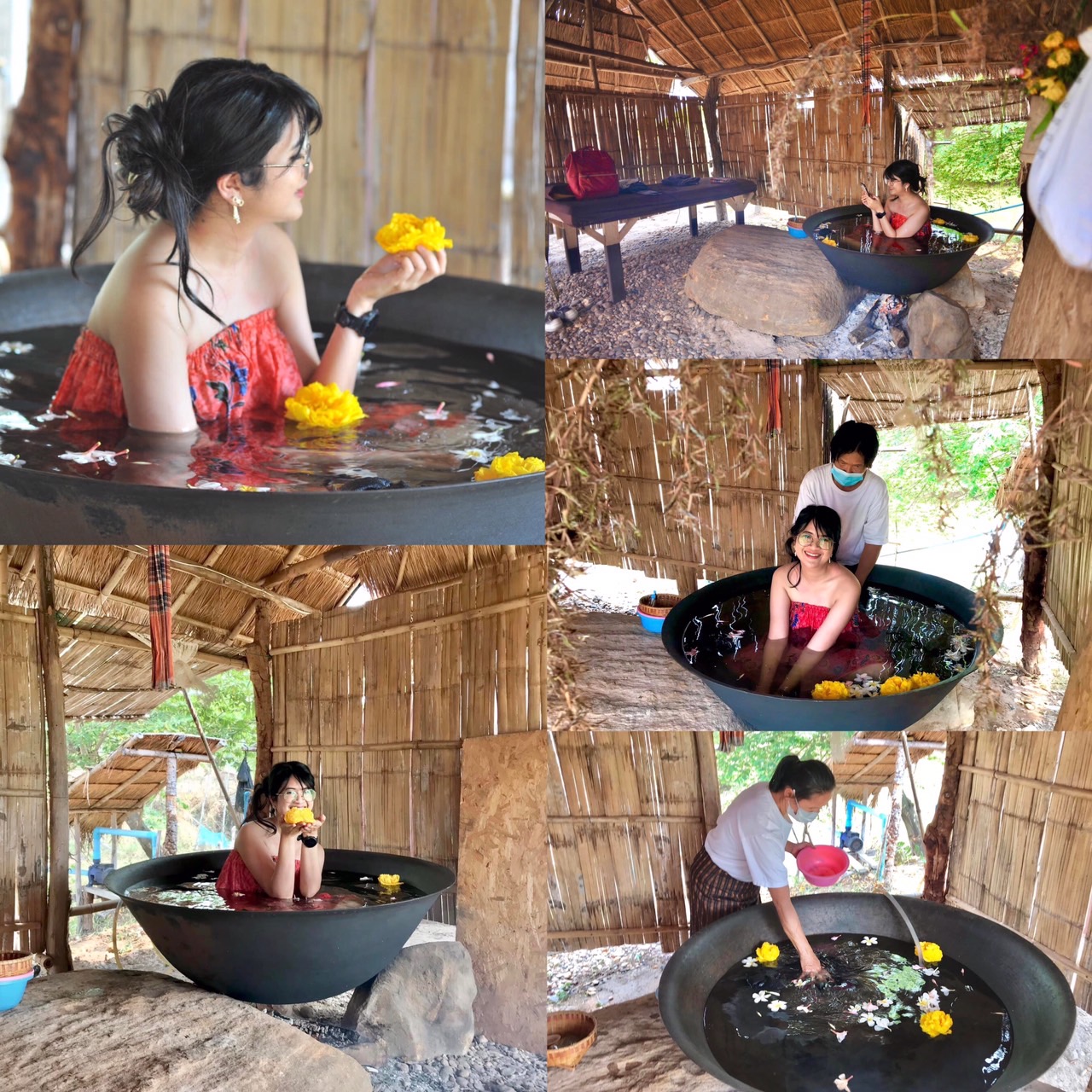 โดยจะมีการนวดตัวด้วยสมุนไพรจากแม่ๆในชุมชนค่ะ ตามด้วยการแช่ในน้ำอุ่นๆ ซึ่งในนี้ก็มีพวกสมุนไพรอบแห้ง เช่น ว่านไฟ ขมิ้น เป็นต้น และยังมีน้ำมันหอมระเหยต่างๆ ขอบอกเลยค่ะว่า สบายตัวมากก และยังช่วยในการบำรุงผิวพรรณอีกด้วย