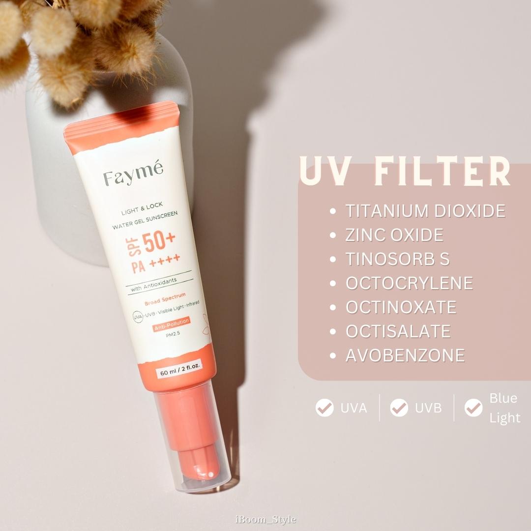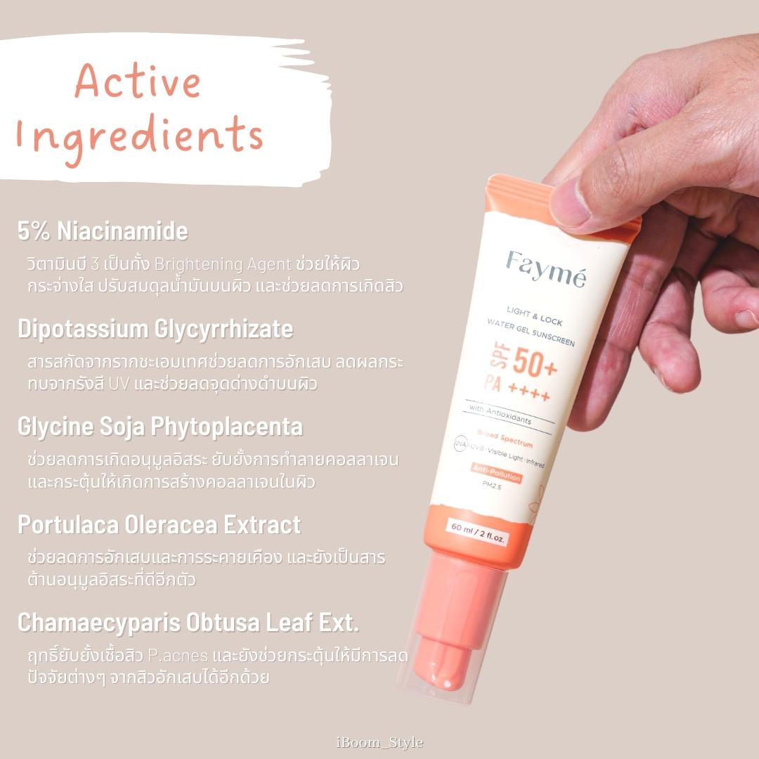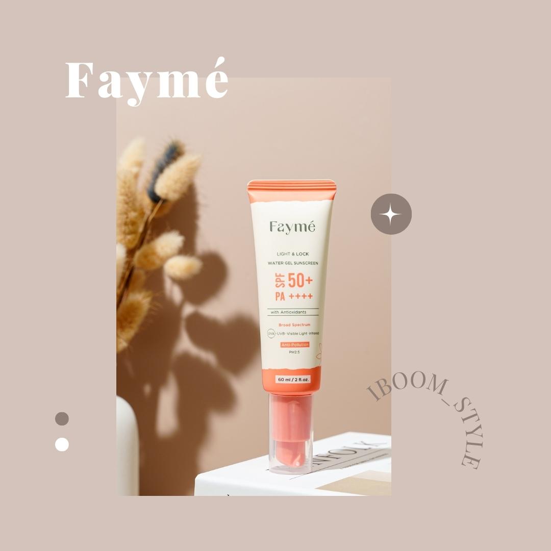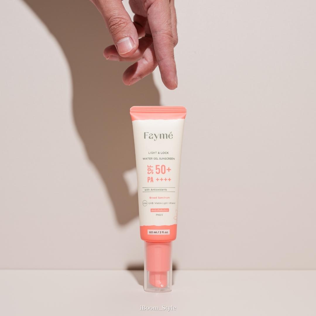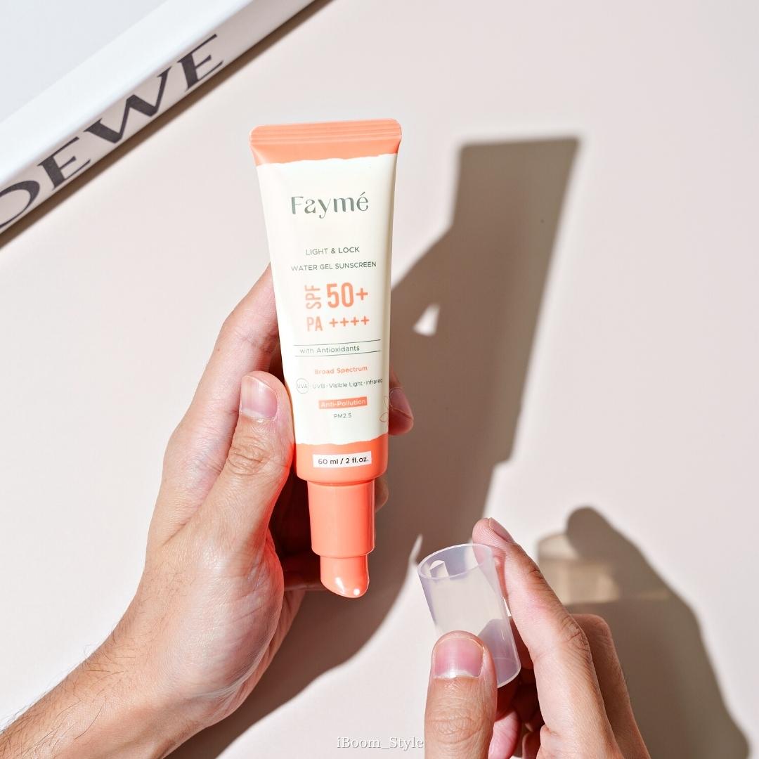 Faymé Light & Lock Water Gel Sunscreen SPF 50+ PA++++ เป็นซันสกรีนสูตรไฮบริดที่ใช้ UV Filter ทั้งแบบ Physical และ Chemical ที่สามารถปกป้องผิวจากรังสียูวี UVA, UVB และ Blue Light แบบครบองค์แถมยังผ่านการทดสอบการระคายเคืองต่อผิวโดยแพทย์ผิวหนัง (ภายใต้มาตรฐาน DRC ประเทศญี่ปุ่น) ว่าเหมาะกับผิวแพ้ง่ายและไม่ก่อให้เกิดสิวและไม่อุดตันผิว แถมยังมาในปริมาณ 60ml เรียกว่าใช้กันไปยาวๆ เลยฮะ