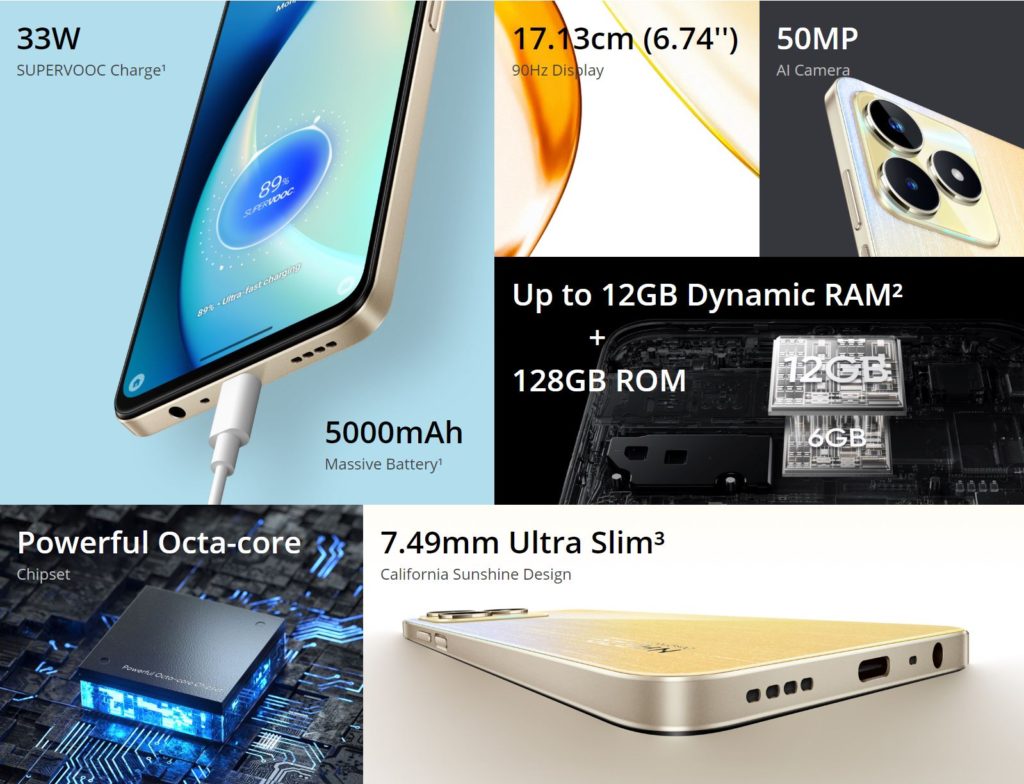 ใช้ชิปเซ็ท Unisoc T612 octa-core ขนาด 12 นาโนเมตร แบบ Octa Core ความเร็ว 1.8GHz จับคู่กับ RAM ขนาด 4GB/6GB หน่วยความจำภายใน ขนาด 64GB/128GB ขยายเพิ่มด้วย microSD Card สูงสุด 1TB, ชิปกราฟฟิก Mali-G57 และรันบนระบบปฎิบัติการ Android 13 ครอบทับด้วย realme UI T