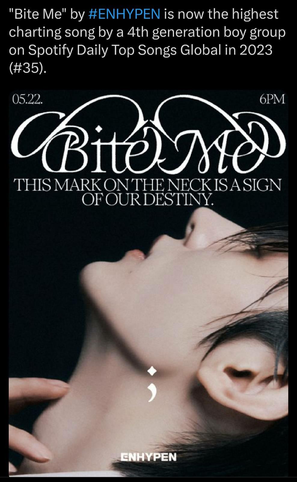 ตอนนี้ Bite Me ของ ENHYPEN สามารถเกาะ Spotify Global 200 มาได้ 25 วันแล้ว โดยขณะนี้เป็นเพลง K-Pop Boy Group ที่เกาะ Chart Spotify Global 200 ได้นานสุดในปี 2023