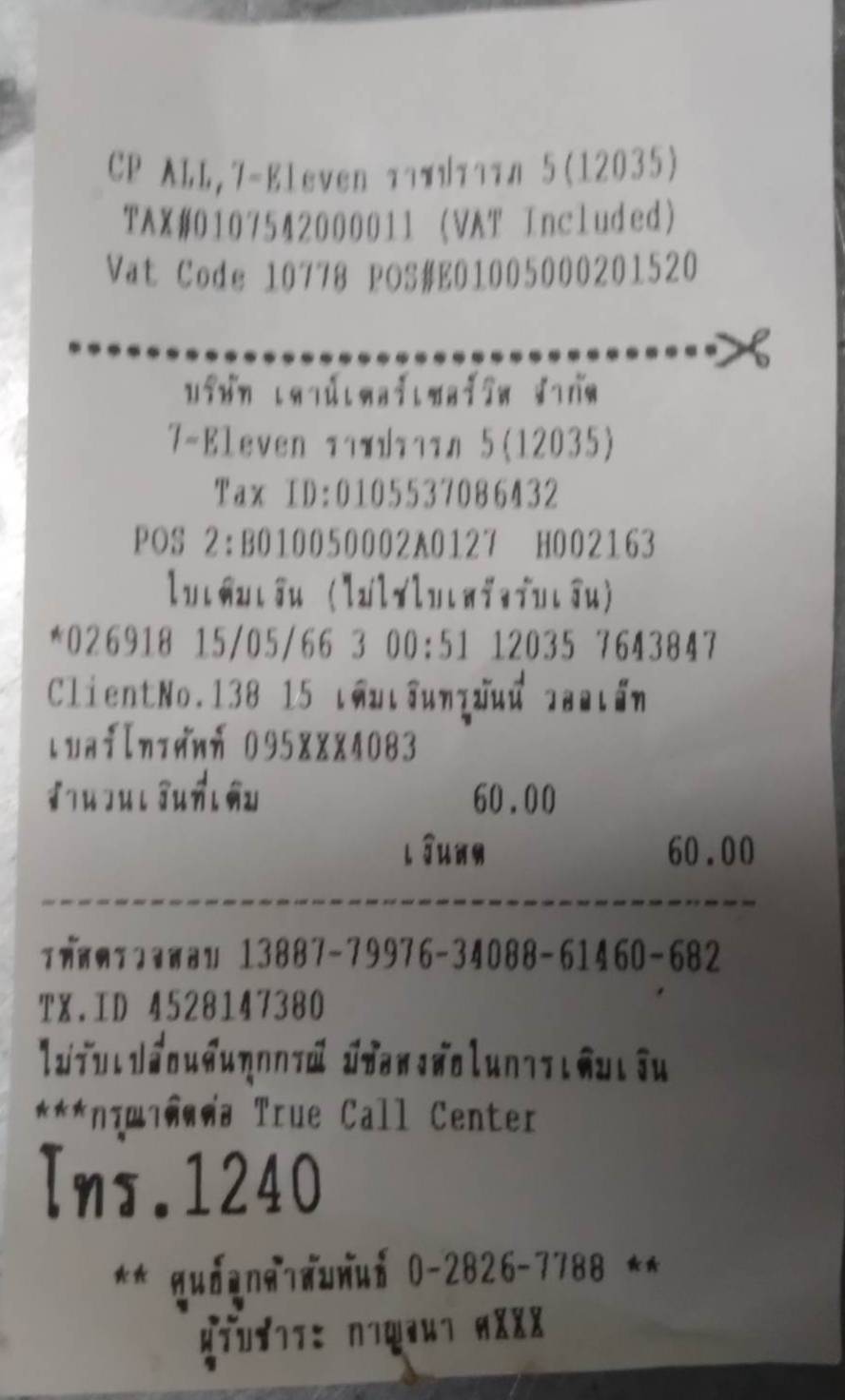 ผมเติมเงินที่เซเว่นแล้วเงินมันไม่เข้าแต่ข้อความมันขึ้นว่าเข้า