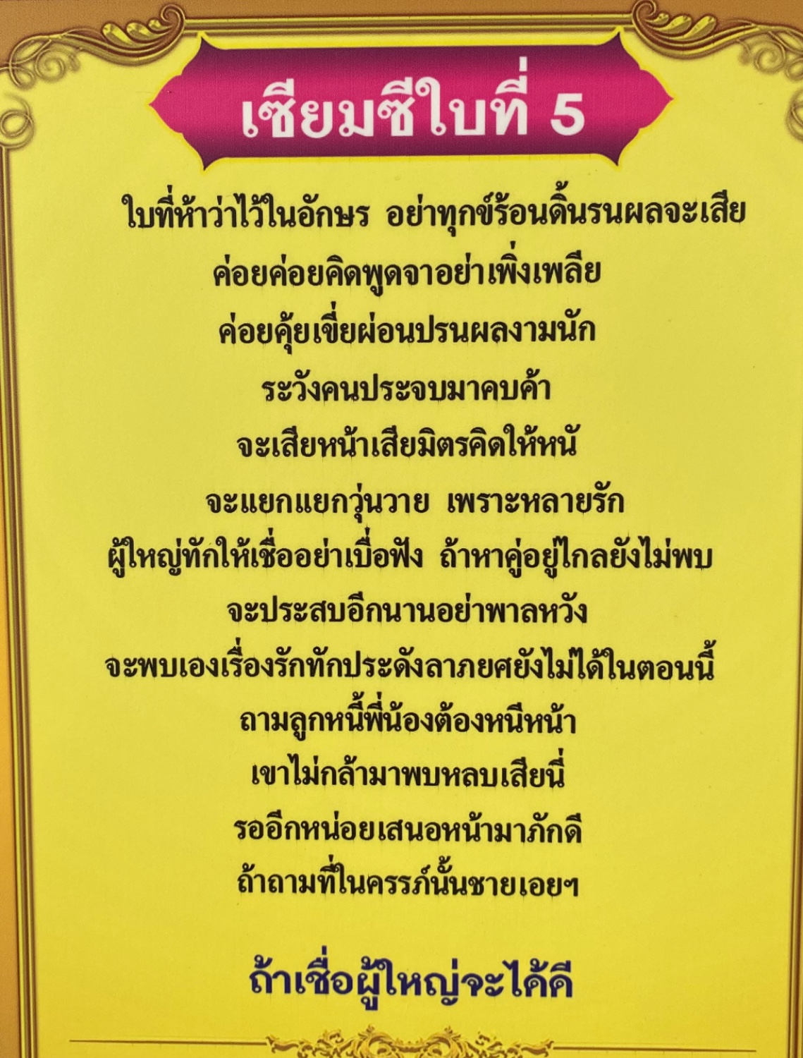 ใบที่เจ็ดเผล็ดผลให้ตนสุข นิราศทุกข์ครอบครัวทั่วเคหา ล้วนบันเทิงเริงรื่นชื่นอุรา แต่ที่ว่าส่วนตัวนั้นกังวลมี ดูให้วุ่นคุนเคืองเรื่องภาระ จิปาถะจุกจิกสุดหลีกหนี อย่าหมกหมุ่นเกินไปจะไม่ดี ตัวเรานี้จะโทรม