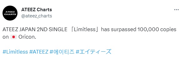 ซึ่งตอนนี้ ซิงเกิ้ลเพลงญี่ปุ่น Limitless ของ ATEEZ สามารถทำยอดขายทะลุ 100,000 copies บน Oricon 🇯🇵 ได้สำเร็จ