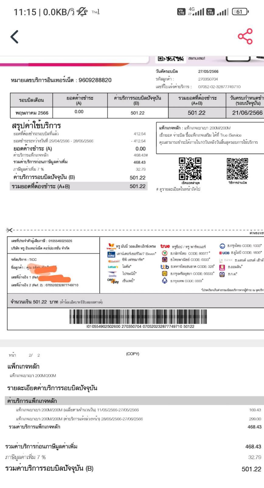 เดือนก่อนๆชำระค่าบริการไปหมดแล้ว ไม่มียอดค้างชำระ พอมารอบบิลนี้ค่าบริการของทรู 501.22บาท แอบงงหน่อยหนึ่ง รบกวนทรูอธิบายหน่อยครับ คิดไปคิดมาอยากย้ายค่ายเน็ตบ้านไปค่ายใหม่จังเลย