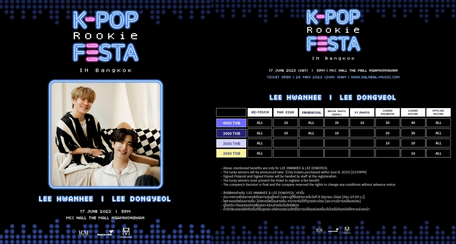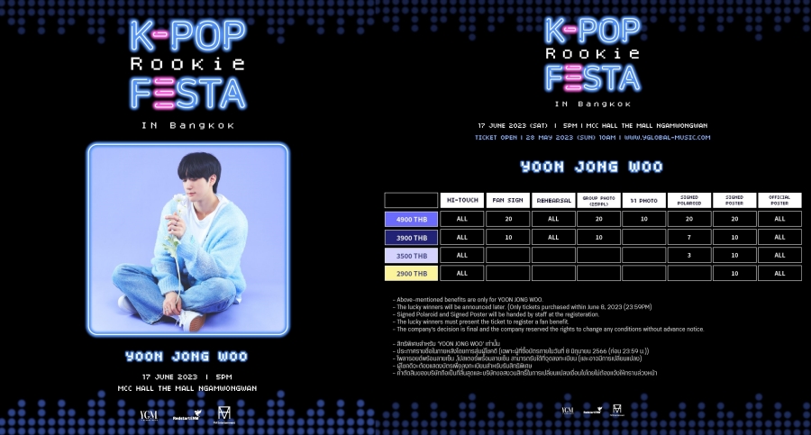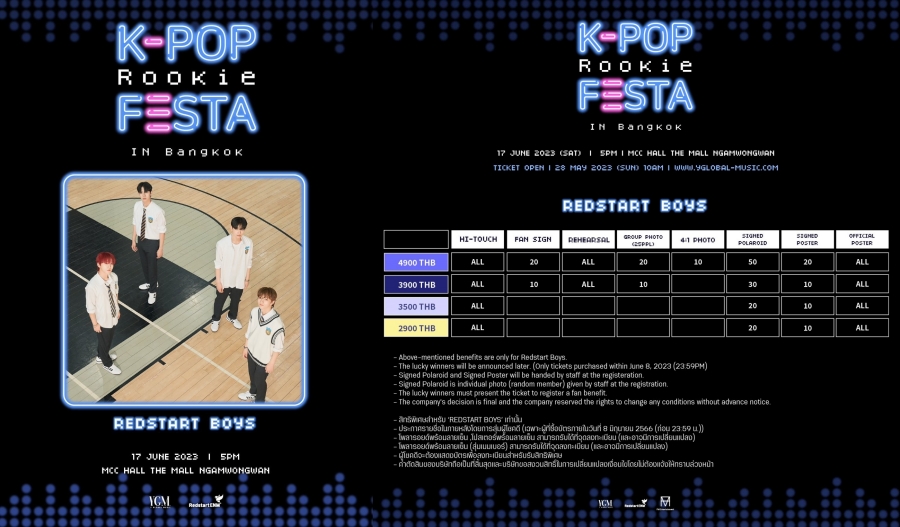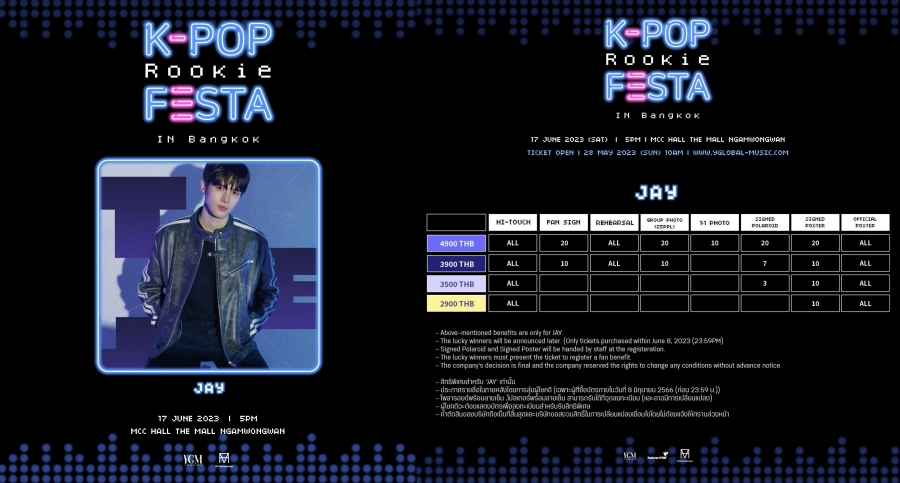 สำหรับงาน 2023 K-POP ROOKIES FESTA in BANGKOK คอนเสิร์ตที่จะรวมเหล่าผู้เข้าร่วมแข่งขันรายการ BOYS PLANET ที่ได้รับความสนใจเป็นจำนวนมากมารวมตัวกันเฉพาะกิจให้แฟนๆ ชาวไทยได้มาร่วมสนุกไปกับคอนเสิร์ตสุดมันส์ ที่พวกเขาทุกคนต่างเตรียมมาโชว์เพอร์ฟอร์แมนซ์แบบปังๆ และมอบความพิเศษแบบใกล้ชิดให้กับแฟนๆ ชาวไทยโดยเฉพาะอีกด้วย งานนี้เปิดขายบัตรผ่านทาง www.yglobal-music.com ในวันอาทิตย์ที่ 28 พฤษภาคม 2566 เวลา 10.00 น.เป็นต้นไป บัตรราคา 4900, 3900, 3500 และ 2900 บาท พร้อมสิทธิพิเศษแบบจุกๆ ทั้ง ไฮทัชกับศิลปินอย่างใกล้ชิดได้ทุกที่นั่งทุกราคาบัตร, สิทธิ์ชมรอบซ้อมการแสดงสำหรับบัตรราคา 4900 และ 3900 ทุกที่นั่ง, สิทธิ์สุ่มผู้โชคดีรับสิทธิ์ แฟนไซน์, สิทธิ์ถ่ายภาพกับศิลปิน, โพลารอยด์พร้อมลายเซ็น, และโปสเตอร์พร้อมลายเซ็น