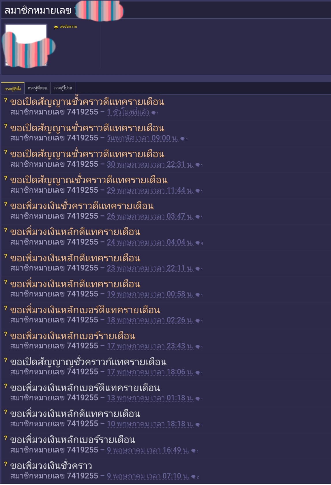 ลองเข้าไปดูประวัติการตั้งกระทู้แล้วก็สงสัยเหมือนกัน เบอร์ที่ขอก็ไม่ซ้ำ แถมบางเบอร์ทาง จนท.โทรไปยืนยันกลับไม่รู้เรื่องหรือไม่ขอปรับยอด สงสัยเหมือนกันว่าเขาทำแบบนี้ทำไม