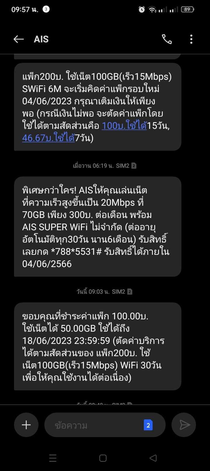 ตอนแรก ปกติเน็ตก็จะตัด หลังจากเติมครบ 280บาท 30วัน 140บาท 15วัน แต่มารอบนี้ ก็เติมปกติ 140บาท แต่มันไม่ยอมหัก เลยเข้าไปดูข้อความก็แจ้งเตือนปกติ แต่มันมี2ข้อความ อันแรก จะต่อแพ็คเกจให้ต่อเนื่อง ในวันที