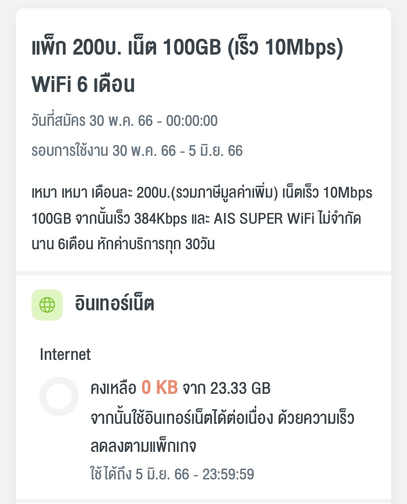 เดิมใช้เน็ตแพ็ก 200บาท. เน็ตไม่จำกัด เร็ว 10Mbps โทรฟรี 30วัน แล้วพอเติมเงินเข้าซิมประมาณ 250 บาท แล้วมีข้อความจาก AIS แจ้งมาว่า "เติมเงินรับสิทธิ์250บ.(รวม VAT) เน็ต 10Mbps 100GB (จากนั้นเร็ว 1M