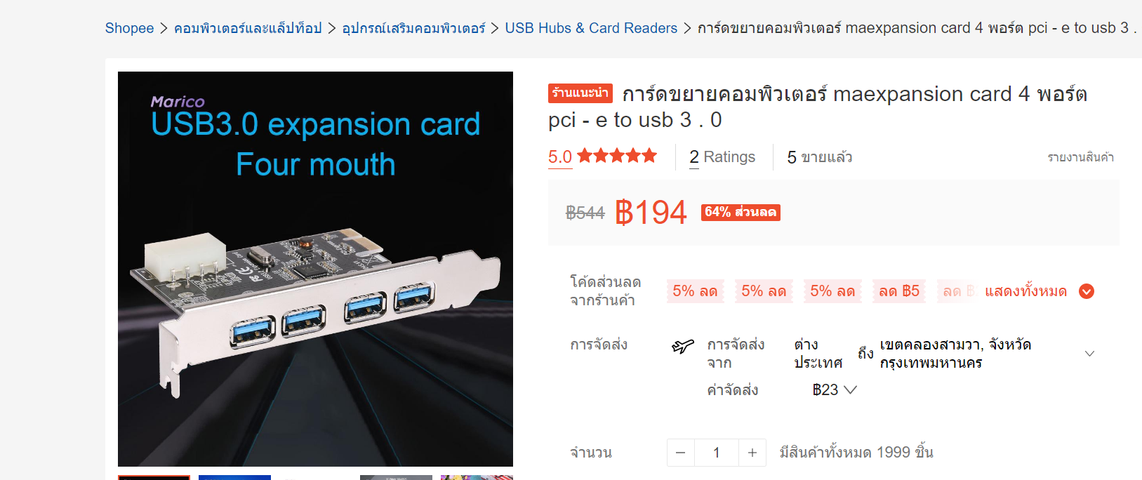 ผมสั่งซื้อ pcl-e usb จาก shopeeในราคา194 บาท เมื่อวันที่2/6/2566