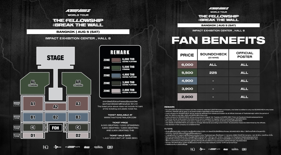 2023 ATEEZ WORLD TOUR [THE FELLOWSHIP : BREAK THE WALL] IN BANGKOK โดยจะเปิดขายบัตรในวันเสาร์ที่ 1 กรกฎาคม 2566 เวลา 10.00 น. เป็นต้นไป ผ่านทางไทยทิกเก็ตเมเจอร์ทุกสาขา และ www.thaiticketmajor.com บัตรราคา 6,000 / 5,500 (บัตรยืน) / 4,900 / 3,900 และ 2,900 บาท พร้อมมอบสิทธิพิเศษให้เหล่าเอทินีที่ซื้อบัตรราคา 6,000 บาททุกที่นั่ง และบัตร 5,500 บาท สุ่มจำนวน 225 สิทธิ์เข้าชมรอบ Soundcheck อีกด้วย