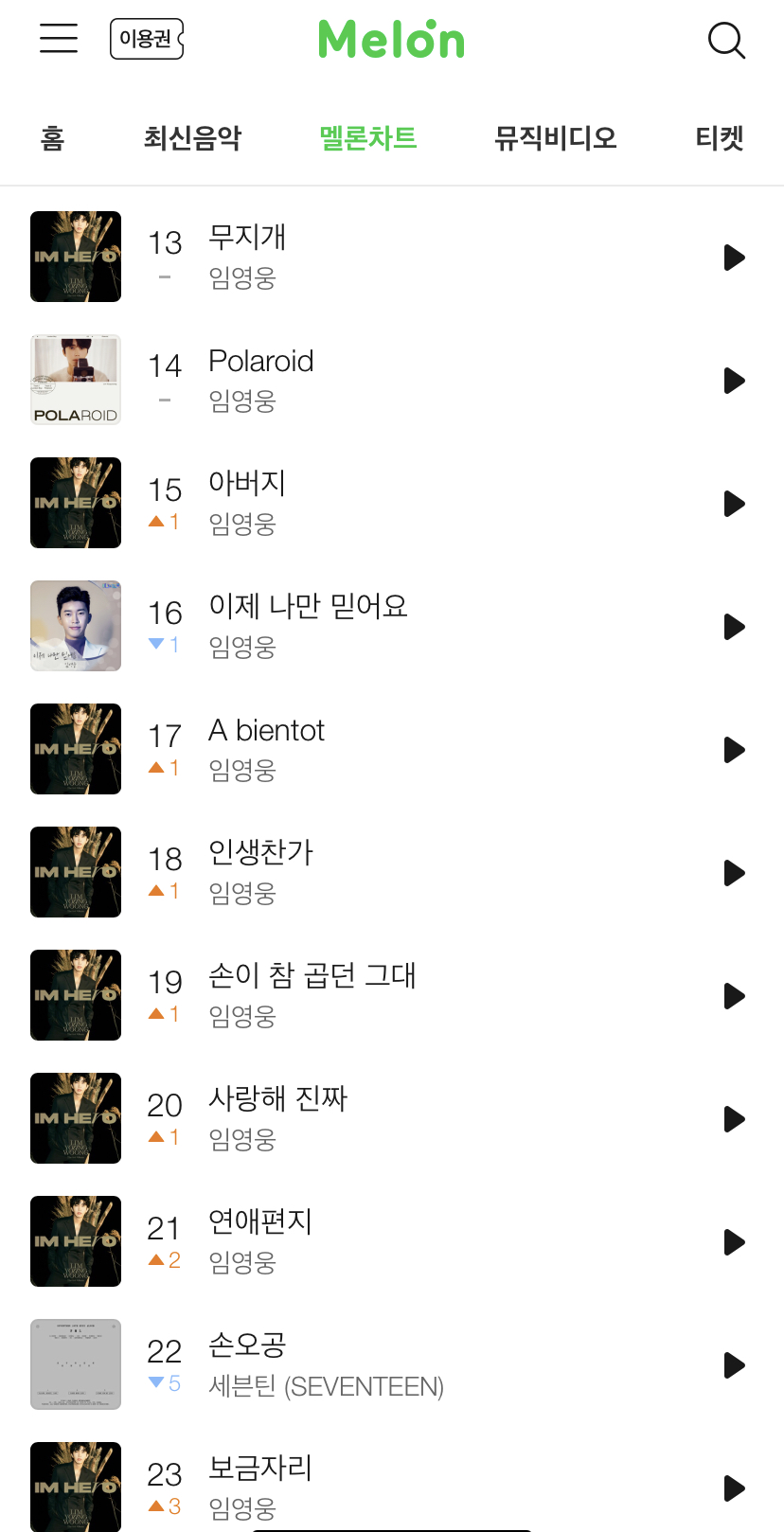 เพลงเก่า เพลงใหม่ ก้มาหมด แต่ไม่ได้แมสขนาดนั้นมั๊ยคะ เพราะ ตี1 เกาหลี 24hits ไม่มีเพลงอิมยองอุงใน TOP10 สักเพลง อิมยองอุงอยู่ที่ 26 แต่เวลาอื่นเพลงมาอยู่บนชาจดันเพลงท้อป10ลงไปหมด รวนเพี้ยนอะไรขนาดเนี๊ย