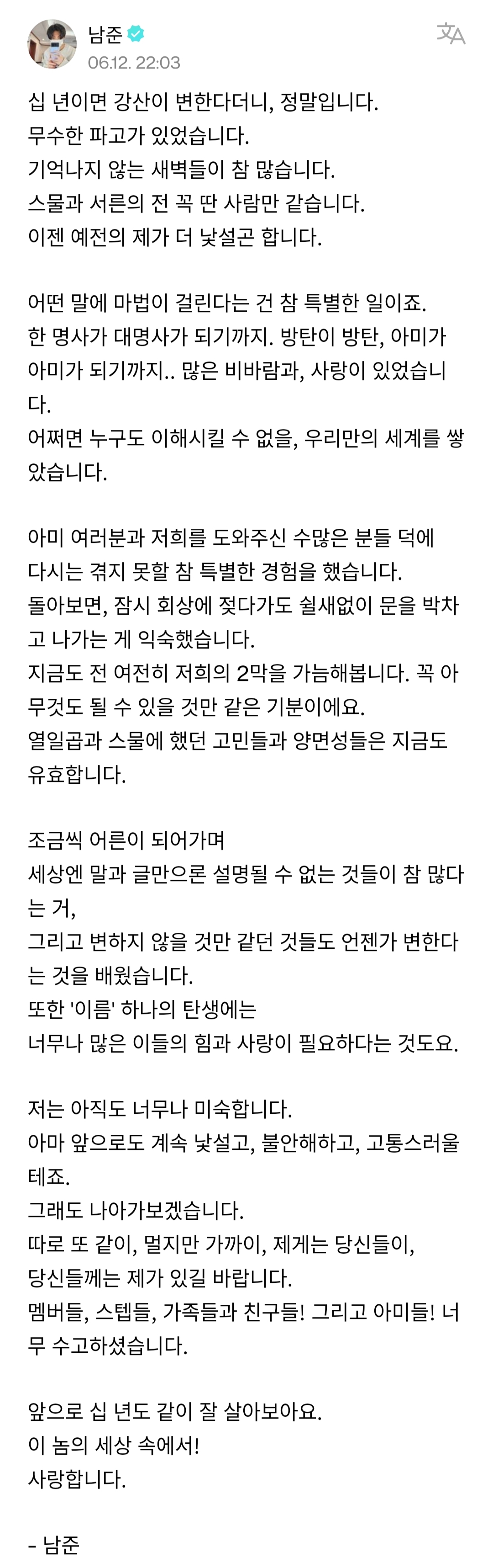 เมมเบอร์, ทีมงาน, ครอบครัว, เพื่อน ๆ และ ARMY! ทุกคนทำงานหนักมาก ขอให้พวกเราอยู่ด้วยกันอย่างมีความสุขในอีก 10 ปีข้างหน้าเช่นกันแม้โลกใบนี้จะเลวร้ายแค่ไหน! ผมรักคุณ