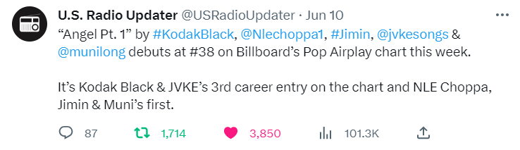 📻 Jimin เป็นเมมเบอร์คนที่ 3 ของ BTS ที่เข้าชาร์ต Billboard 's Pop Airplay radio chart ในเพลง "Angel Pt.1"