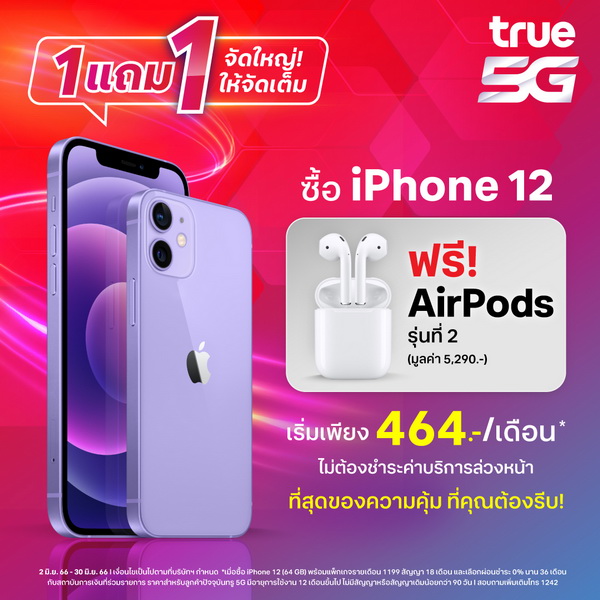ทรู 5G จัดใหญ่ จัดเต็มซื้อ 1 แถม 1 พิเศษกว่านี้ไม่มีอีกแล้ว ซื้อ iPhone 12 แถมฟรี! AirPods 2 มูลค่า 5,290 บาท ตั้งแต่วันนี้ถึง 30 มิ.ย. 66