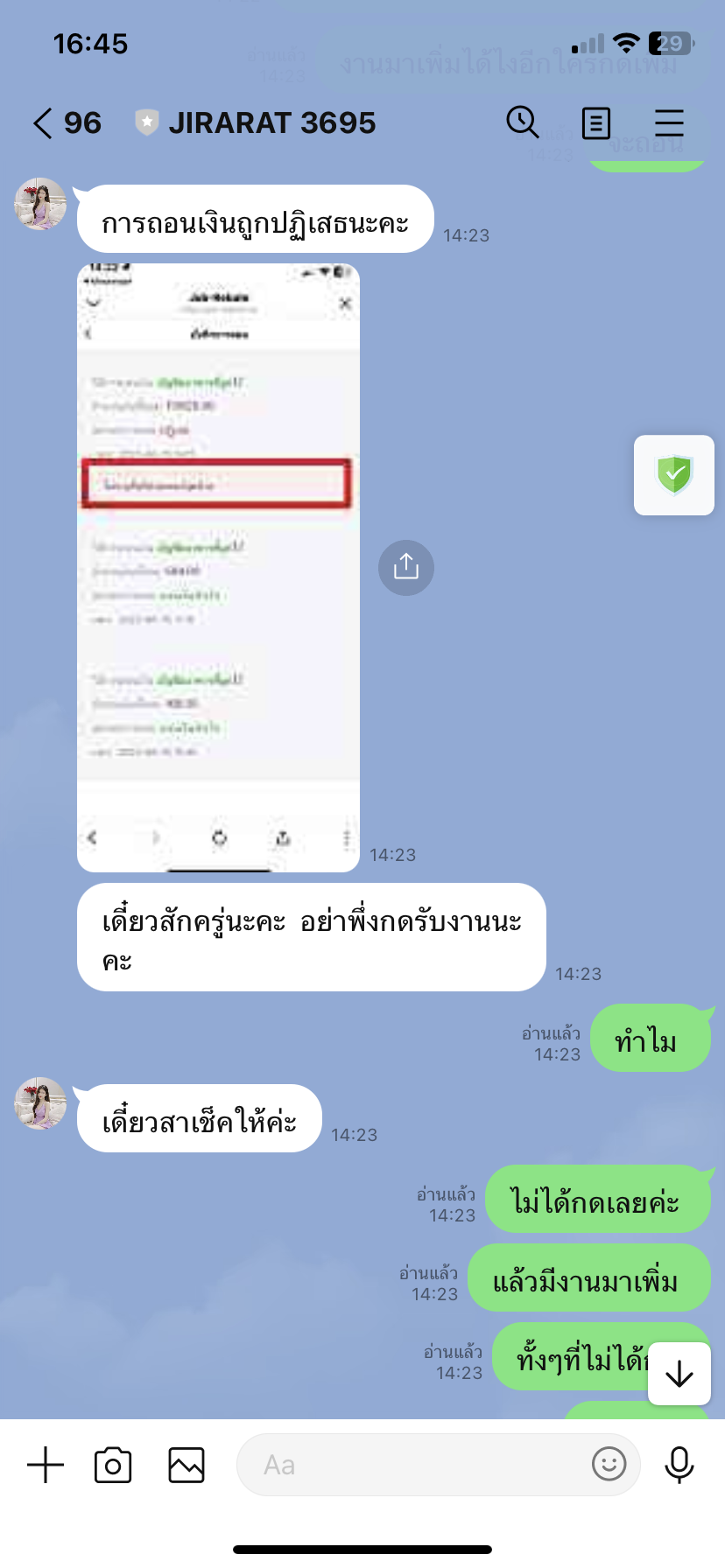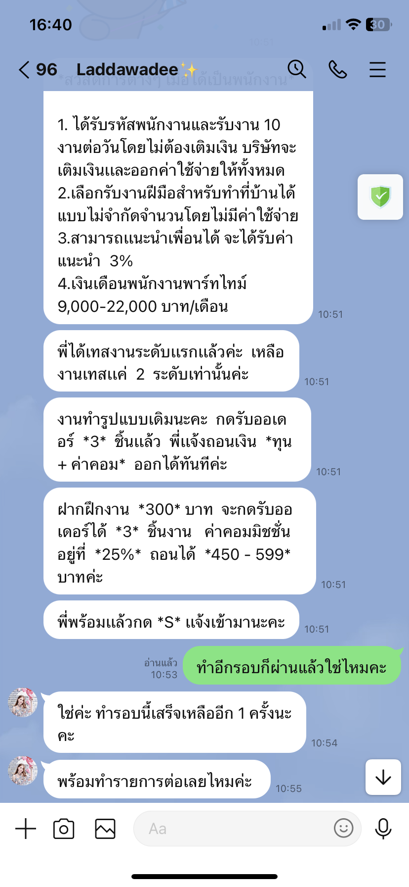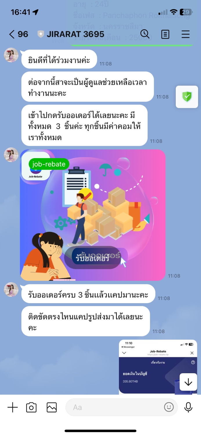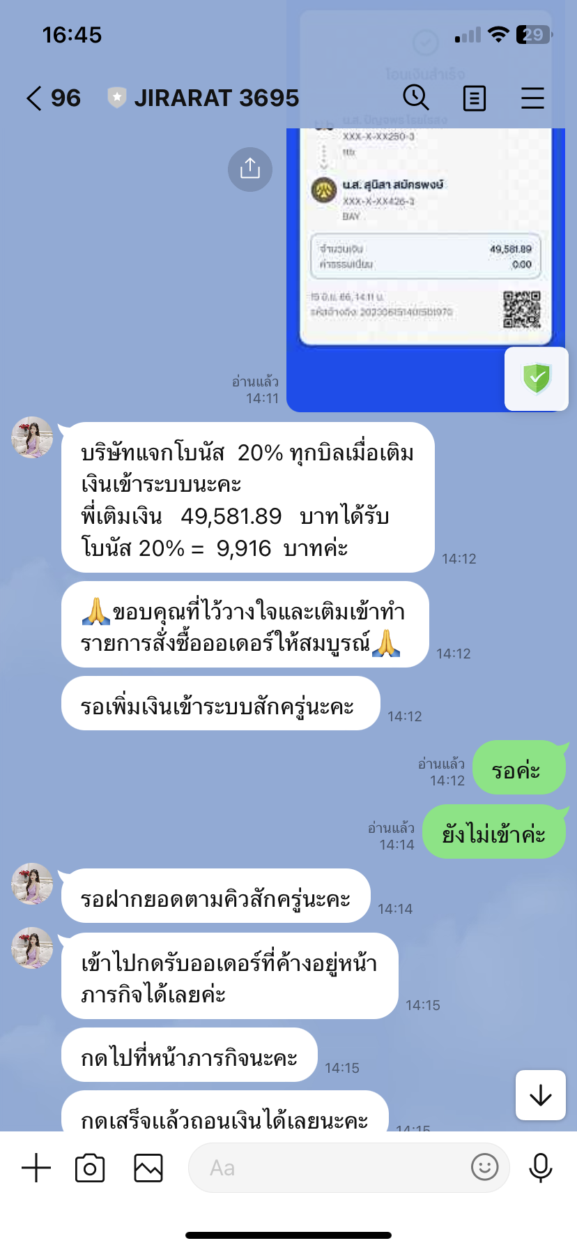 ตั้งใจเข้าหาดูงานออนไลน์เสริม อยากหารับงานออนไลน์มาแพ็คของที่บ้าน แต่โดนโกงให้ทดลองงานต่อเนื่องให้ครบ3ระดับ จากนั้นก็จะได้งานมาทำที่บ้านโอนเงิน ครั้งแรก100 พร้อมได้โบนัส ครั้งที่2โอนอีก160 พร้อมได้โบนัสคืน500+ ให้ทำภารกิจให้เสร็จสินถึงจะส่งงานมาให้ทำที่บ้าน ภารกิจมีต่อไปเลื่อยๆไม่รู้จักจบ จนถึงภารกิจสุดท้ายจะถอนเงิน ถอนไม่ได้แจ้งมาว่าไม่ได้บันทึกสลิปว่าออเดอร์สุดท้าย ถอนเงินเงินไม่ได้ เตือนภัยทุกๆคนนะคะ เป็นความผิดพลาดและความโง่ที่ไม่ศึกษาดูดีๆก่อน ของเราเองด้วยโดนไป80000+ ไม่อยากให้ใครโดนด้วยหรือใครโดนเหมือนกันช่วยกันเตือนภัยนะคะ