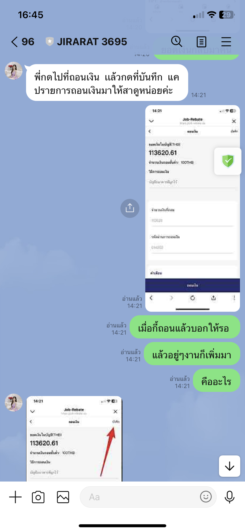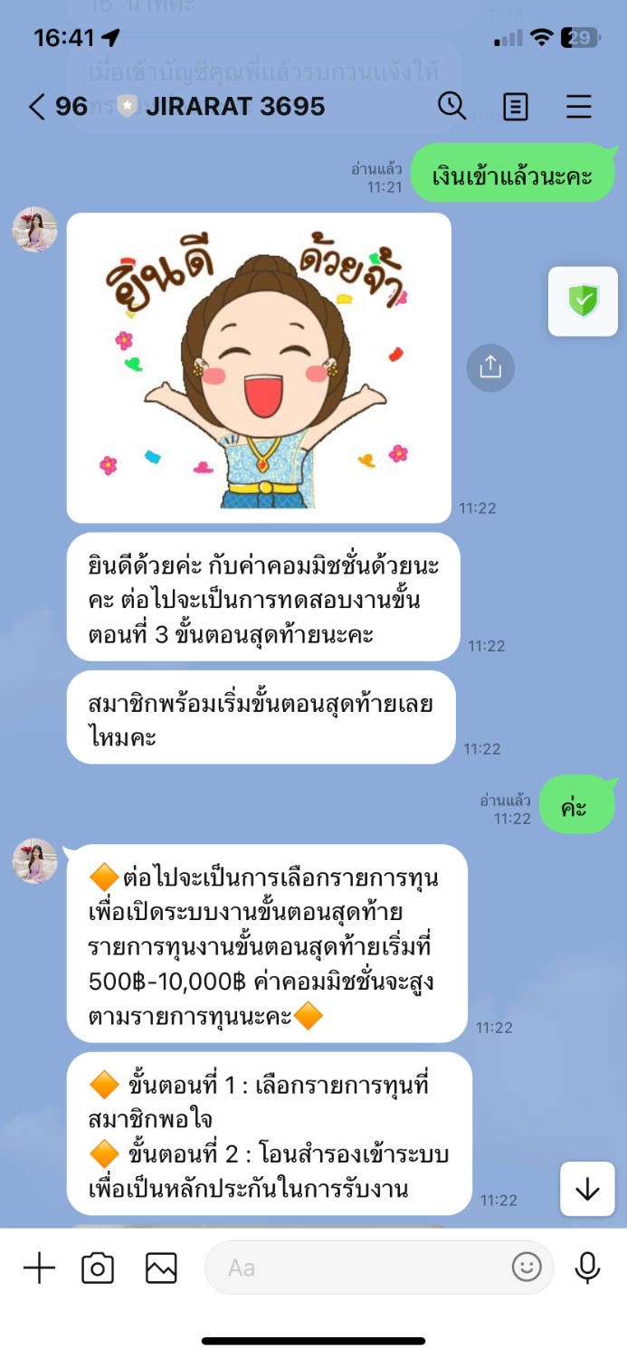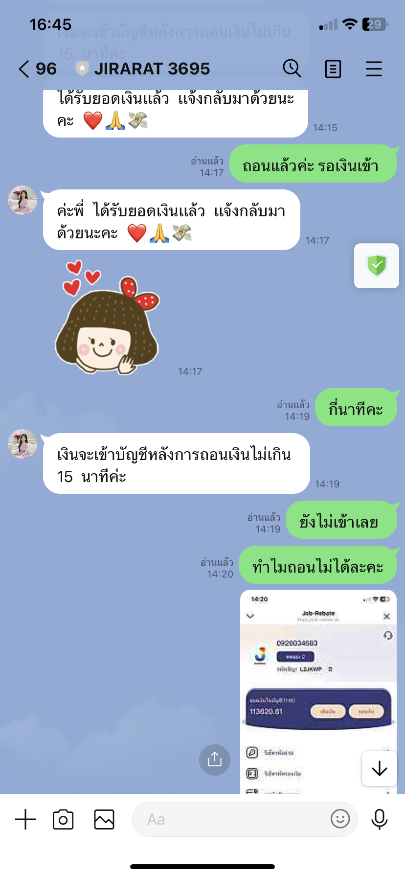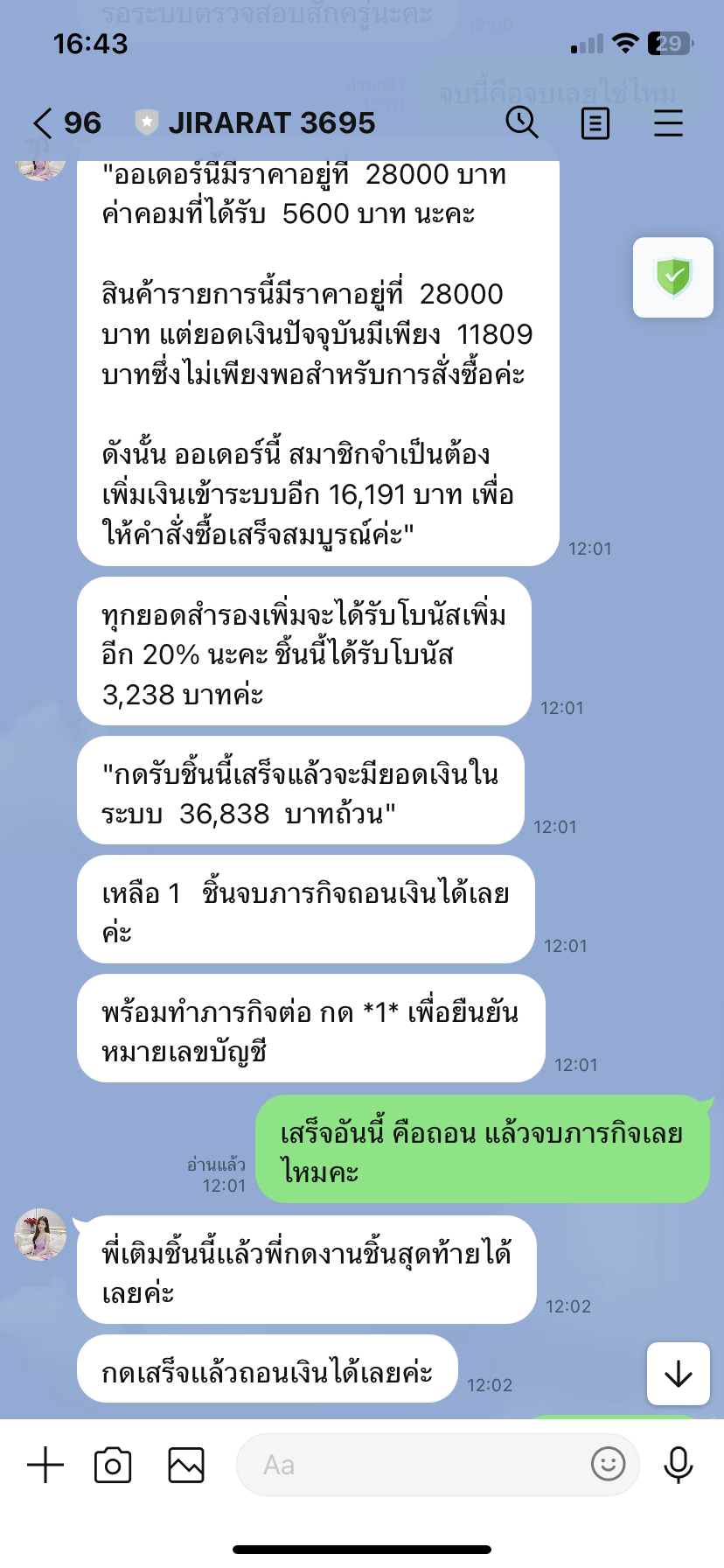 ตั้งใจเข้าหาดูงานออนไลน์เสริม อยากหารับงานออนไลน์มาแพ็คของที่บ้าน แต่โดนโกงให้ทดลองงานต่อเนื่องให้ครบ3ระดับ จากนั้นก็จะได้งานมาทำที่บ้านโอนเงิน ครั้งแรก100 พร้อมได้โบนัส ครั้งที่2โอนอีก160 พร้อมได้โบนัสคืน500+ ให้ทำภารกิจให้เสร็จสินถึงจะส่งงานมาให้ทำที่บ้าน ภารกิจมีต่อไปเลื่อยๆไม่รู้จักจบ จนถึงภารกิจสุดท้ายจะถอนเงิน ถอนไม่ได้แจ้งมาว่าไม่ได้บันทึกสลิปว่าออเดอร์สุดท้าย ถอนเงินเงินไม่ได้ เตือนภัยทุกๆคนนะคะ เป็นความผิดพลาดและความโง่ที่ไม่ศึกษาดูดีๆก่อน ของเราเองด้วยโดนไป80000+ ไม่อยากให้ใครโดนด้วยหรือใครโดนเหมือนกันช่วยกันเตือนภัยนะคะ