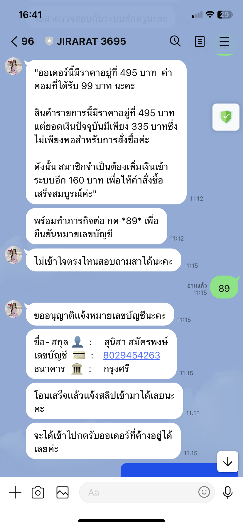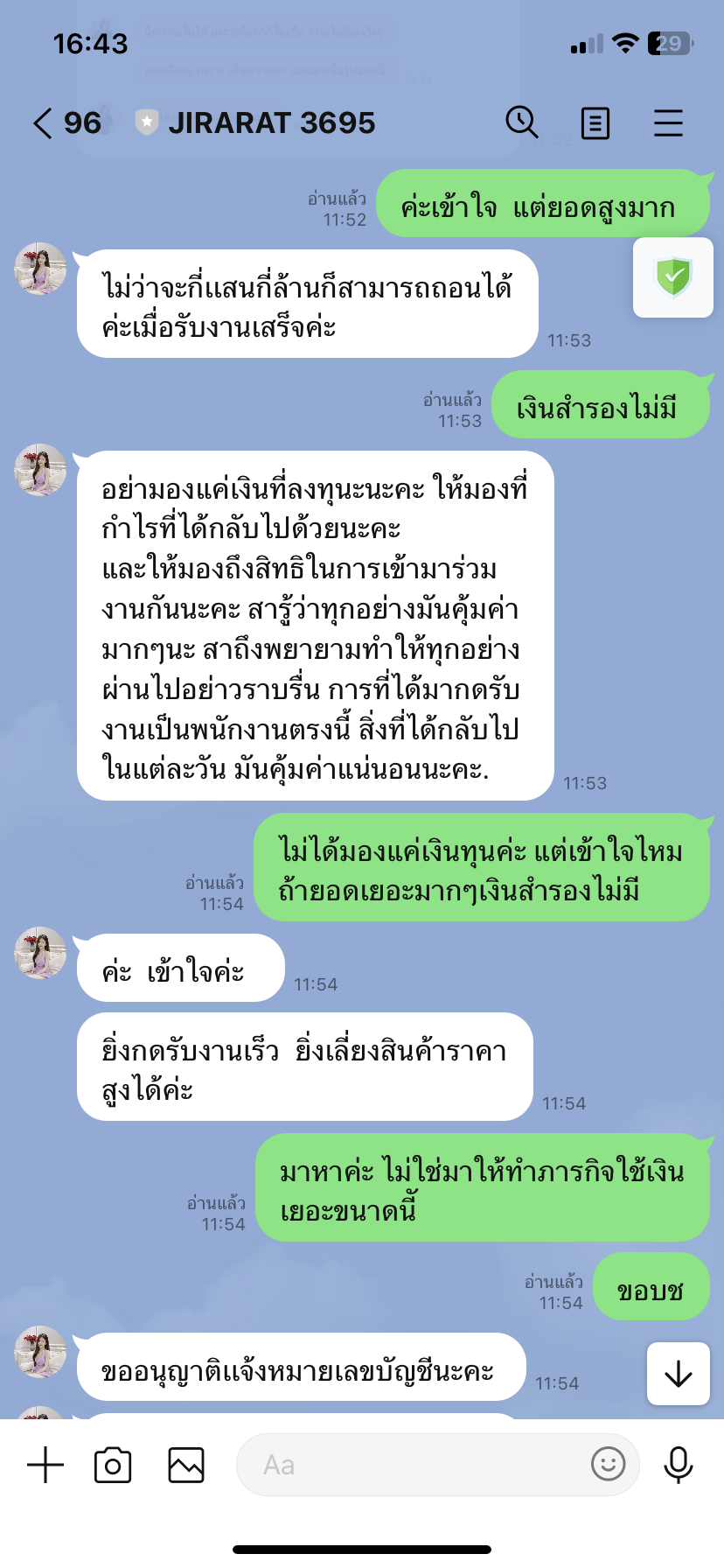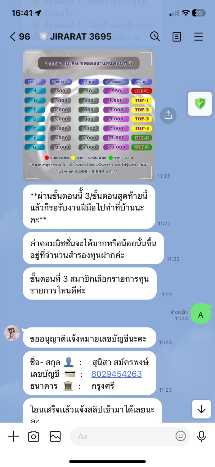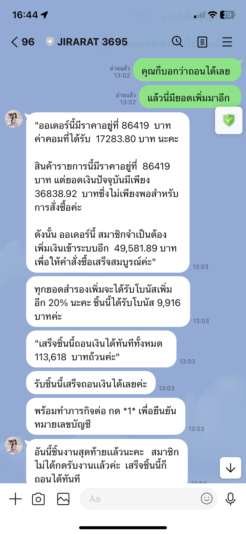 ตั้งใจเข้าหาดูงานออนไลน์เสริม อยากหารับงานออนไลน์มาแพ็คของที่บ้าน แต่โดนโกงให้ทดลองงานต่อเนื่องให้ครบ3ระดับ จากนั้นก็จะได้งานมาทำที่บ้านโอนเงิน ครั้งแรก100 พร้อมได้โบนัส ครั้งที่2โอนอีก160 พร้อมได้โบนัสคืน500+ ให้ทำภารกิจให้เสร็จสินถึงจะส่งงานมาให้ทำที่บ้าน ภารกิจมีต่อไปเลื่อยๆไม่รู้จักจบ จนถึงภารกิจสุดท้ายจะถอนเงิน ถอนไม่ได้แจ้งมาว่าไม่ได้บันทึกสลิปว่าออเดอร์สุดท้าย ถอนเงินเงินไม่ได้ เตือนภัยทุกๆคนนะคะ เป็นความผิดพลาดและความโง่ที่ไม่ศึกษาดูดีๆก่อน ของเราเองด้วยโดนไป80000+ ไม่อยากให้ใครโดนด้วยหรือใครโดนเหมือนกันช่วยกันเตือนภัยนะคะ
