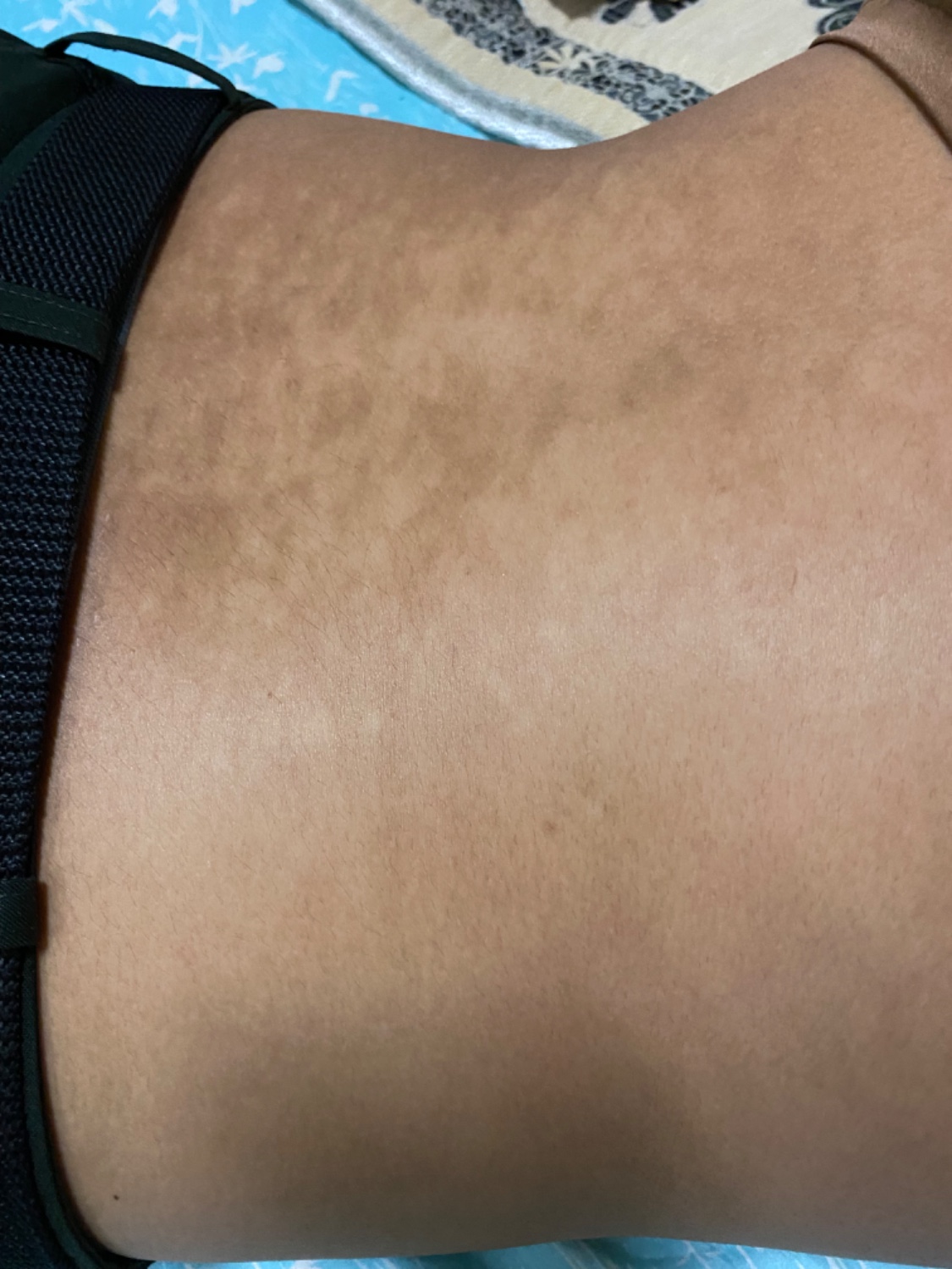 คือเราเกิดอาการคันบริเวณต้นขา เลยเกา ไม่ได้สังเกตอะไรมาเห็นอีกทีเป็นแบบนี้เลยค่ะ ปื้นๆสีน้ำตาล มีอาการคันอย่างเดียว มีขุยๆลอกขาวๆ ไม่เจ็บนะคะ ขนาดใหญ่ประมาณครึ่งฝ่ามือ (รูป1) แล้วก็มีอาการผิวลอกเป็นจุ