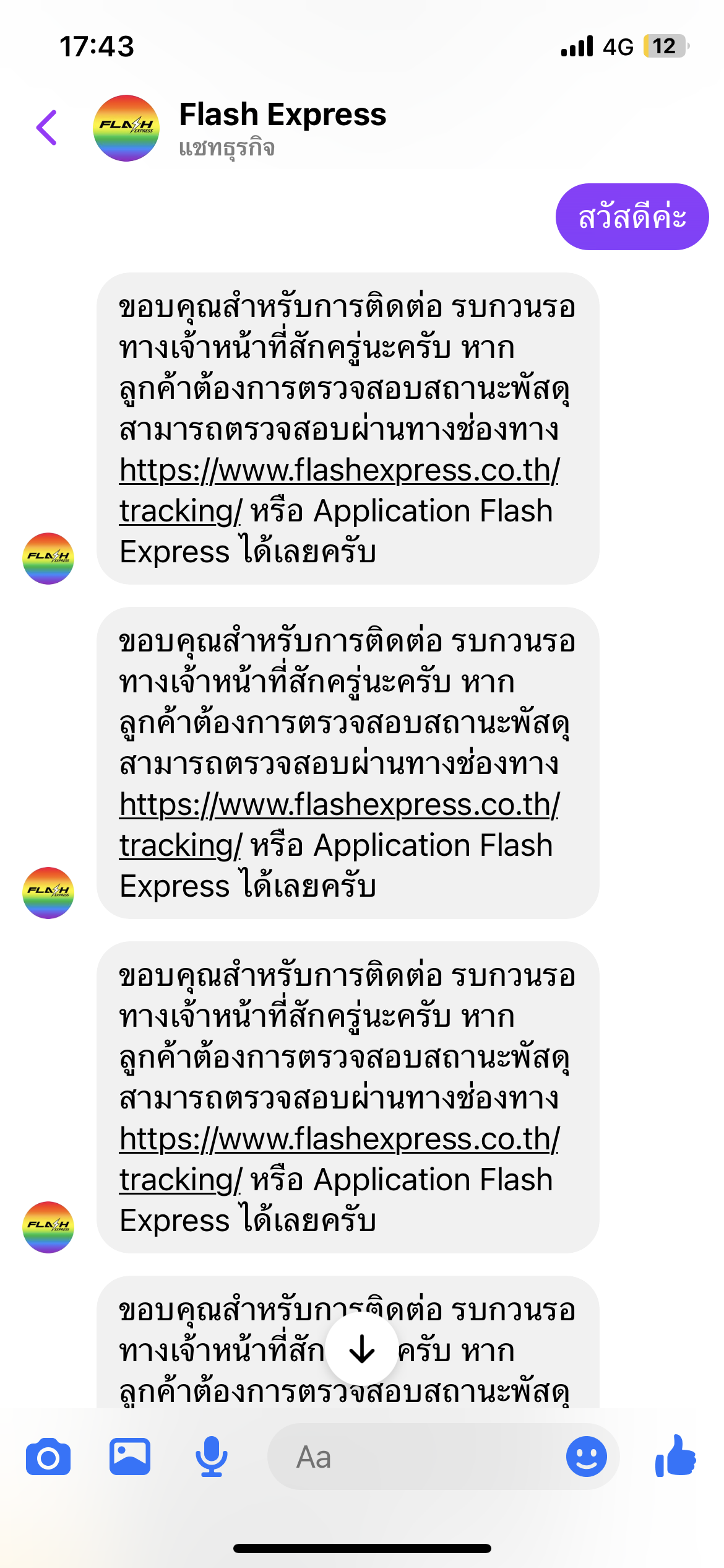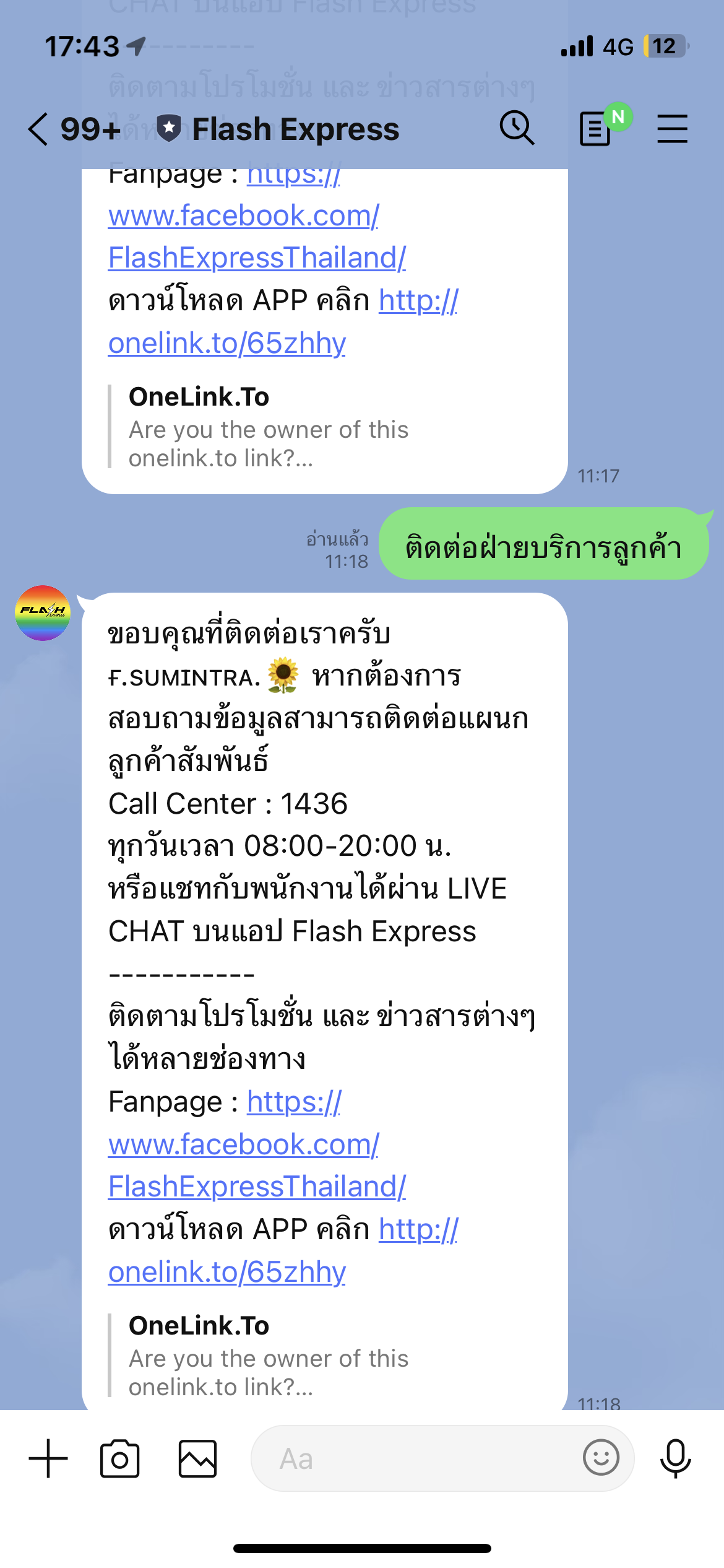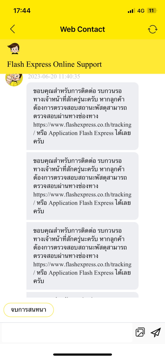 สั่งของตั้งแต่วันที่ 13 ตอนนี้วันที่20 ยังไม่ได้ของ แล้วพัสดุขึ้นกำลังจัดส่งตั้งแต่18 อยู่พัสดุก็ตีกลับไปที่คลัง เราก็ไม่อะไร วันที่19 ก็เหมือกันอีก แต่วันนี้ขึ้นมีการสนทนากับเรา 16วิ ทั้งๆที่เรายังไม่ได้รับสายจากขนส่งเลย แถมยังขึ้นอีกว่า ลูกค้าเปลี่ยนแปลงเวลารับพัสดุ (เปลี่ยนเเปลงไรทั้งๆที่เรารอขนส่งโทรมาตลอด) เราเลยหาช่องทางติดต่อเจ้าหน้าที่แต่ไม่มีวี่แววว่าจะได้คุยเลย ไม่ว่าจะ facebook Line call center และแอพ flash expressห่วยแตกมาก ค้างอยู่คลังมา2วันละ