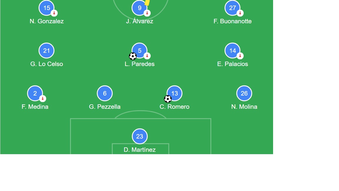 ดูรายชื่อของอาร์เจนตินาแล้ว ก็ไม่ได้ขี้เหร่เลย มีหน้าเป้าโคตรคม อย่าง ฮูเลี่ยน อัลวาเรซ ของแมนซิ กองกลาง ปาเรเดซ, ปาลาซิออส, โล เซลโซ กองหลัง โรเมโร ก็ตัวจริง ของอาร์เจนตินา และแบ็คขวา โมลินา ก็ตัวจริงอาร์เจนฯ ผู้รักษาประตูก็ตัวจริงทีมชาติ เอมิลิอาโน มาร์ติเนซ