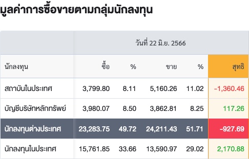 Sinthorn Summary 22/6/2566 : ต่างชาติขายสุทธิ -927.69 ลบ.