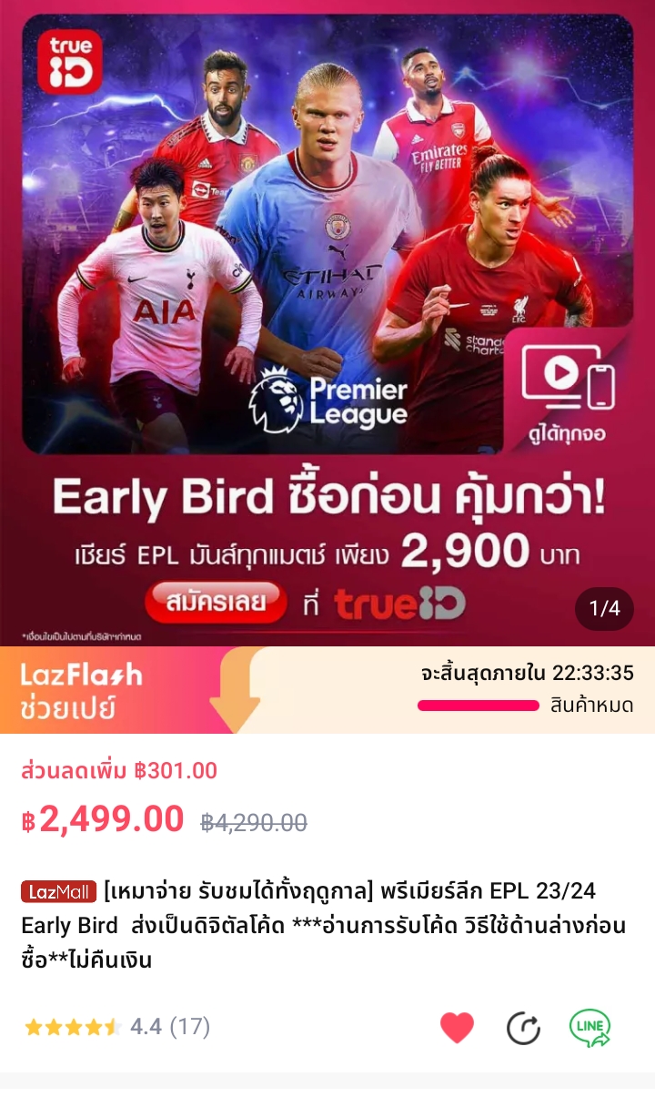 ลาซาด้าจัดโปรลดราคาแพ็คเกจพรีเมียร์ลีก Early Bird ลงมาอีก แต่ว่า....