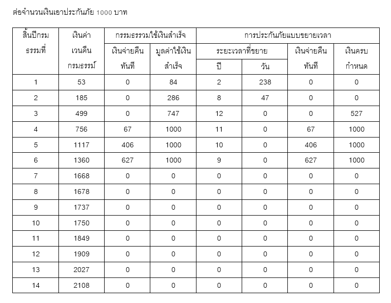 ปีกรมธรรม์ที่ 1-10 จะจ่ายเงิน 200% ของจำนวนเงินเอาประกันภัย
