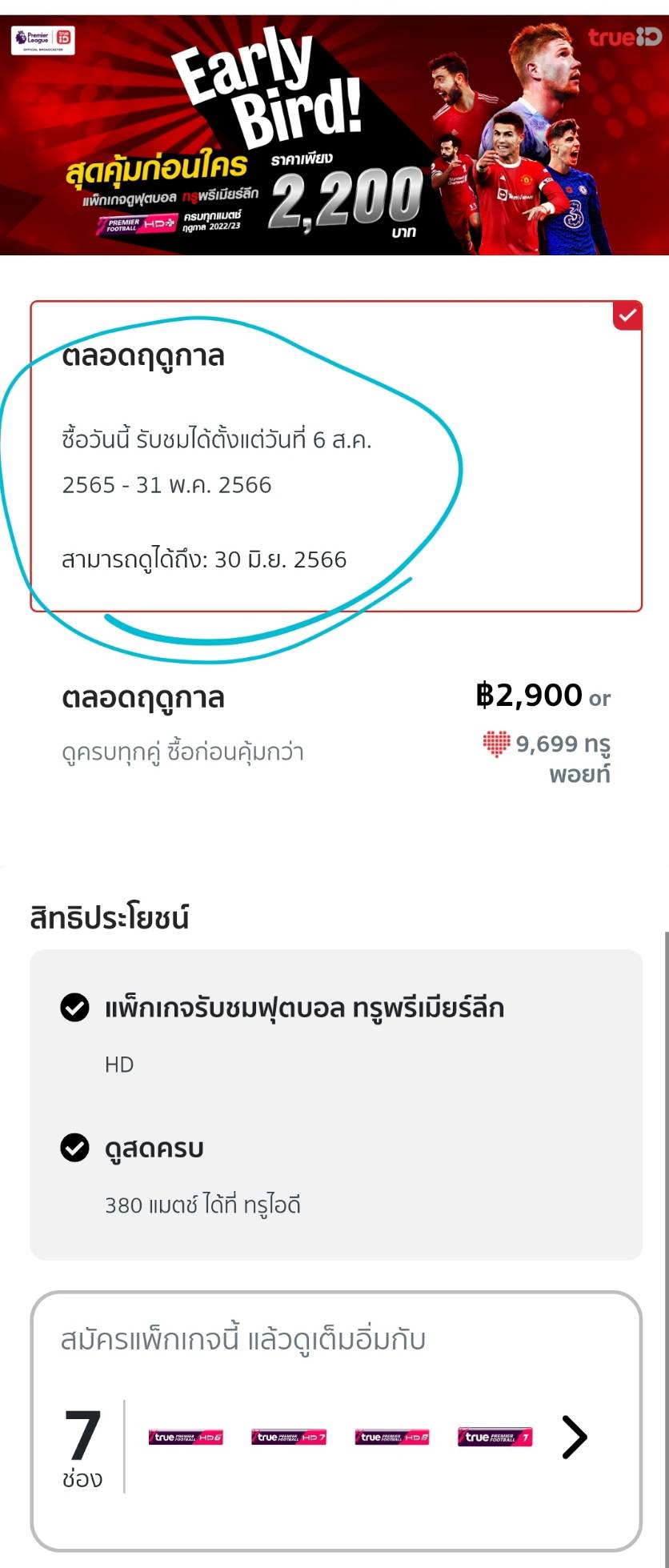 สมัครดูบอลทั้งปี2,900บาท ในแอ๊ป True id แต่ไม่มั่นใจเงื่อนไขระยะเวลา