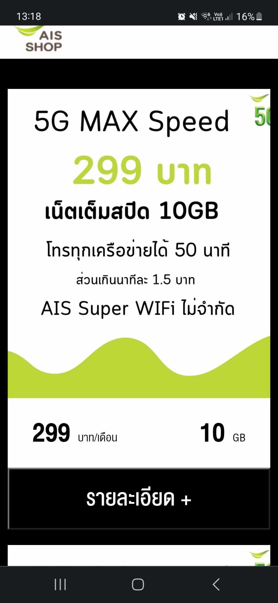 ตอนนี้ผมใช้แพ็กเกจ AIS 5G Max Speed 499 บาท/เดือน • เน็ตไม่จำกัดความเร็ว • โทรฟรี 250 นาที แต่เพิ่งมาเห็นว่ามีโปร 300 บาท/เดือน • ได้เน็ต 100GB (5G เต็มสปีด 20GB + เน็ตต่อเนื่องสูงส