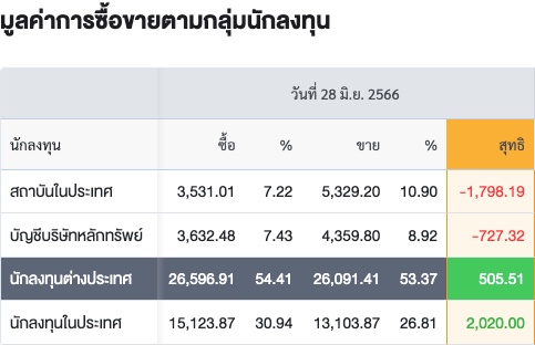 Sinthorn Summary 28/6/2566 : ต่างชาติซื้อสุทธิ 505.51 ลบ.