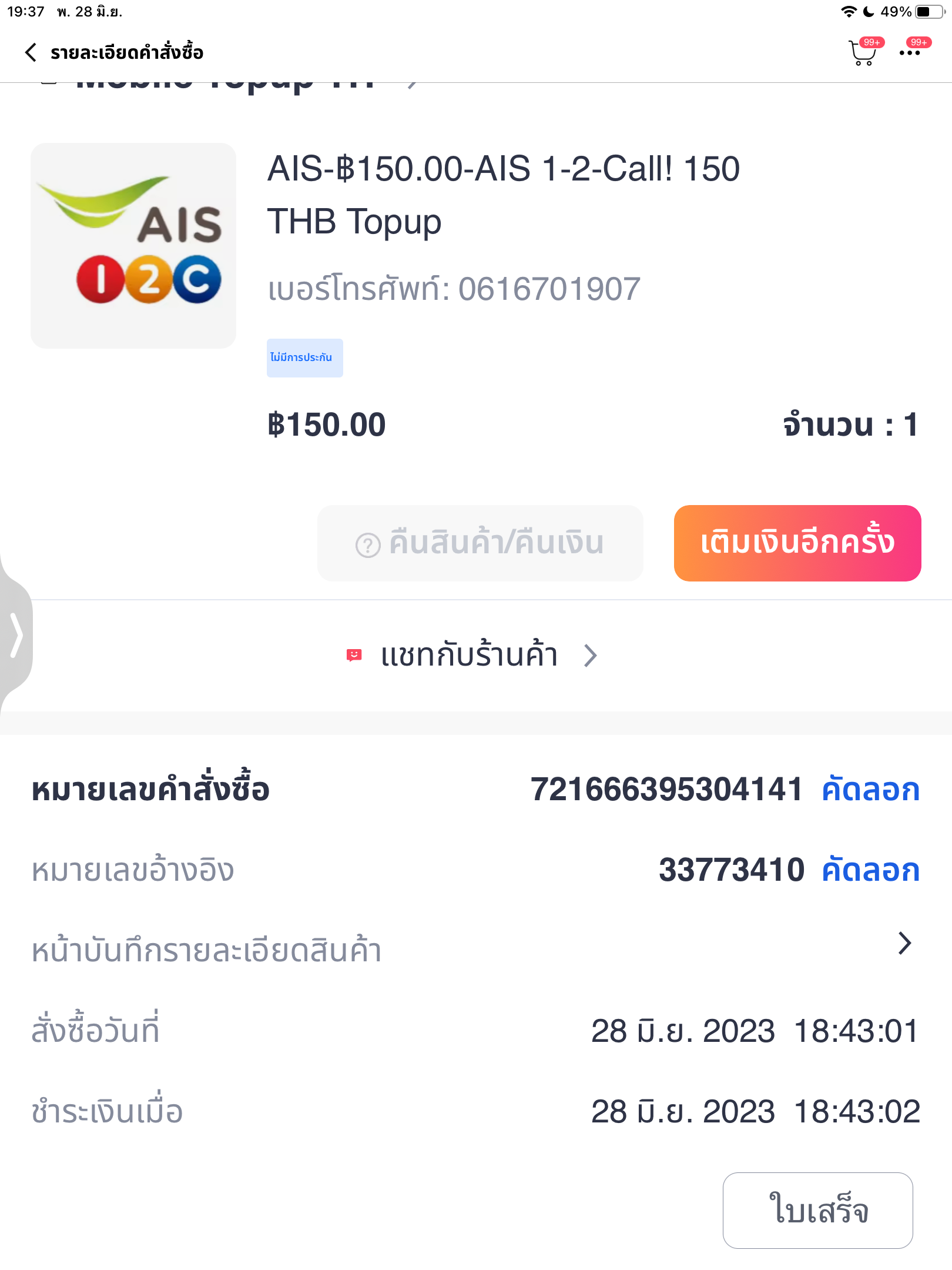 เติมเงินผิดเบอร์ในลาซาด้าaisเอาเงินคืนยังไงคะ
