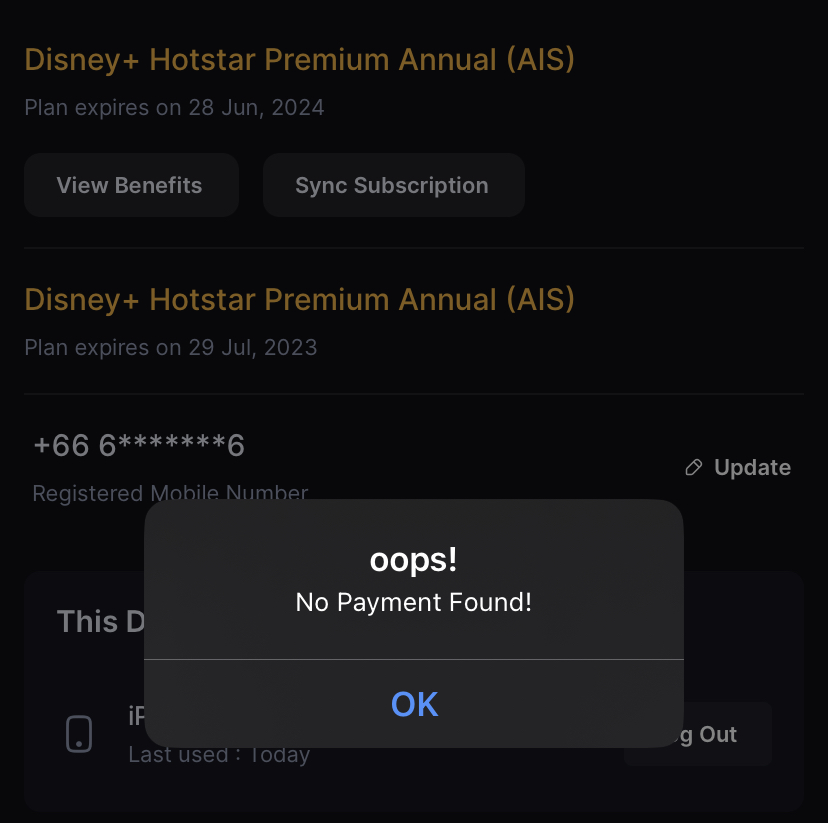 เนื่องจากแพ็กเกจรายปีเดิมใกล้หมดอายุ และที่ได้อ่านข้อมูลมา CC แจ้งว่าสามารถสมัคร Disney+ Hotstar รายปีซ้อนกับแพ็กเกจรายปีเดิมได้ และระบบจะนับระยะเวลาตามรายการใหม่ จึงได้สมัครรายปีกับ AIS ใหม่ซ้อนไป แต่เมื่อเข้าแอพ Disney+ แล้วไม่ได้ระยะสมาชิกเพิ่ม จึงลองกด sync subscription ก็ขึ้นข้อความไม่พบการจ่ายเงิน ดังรูป ไม่ทราบว่าการสมัครสำเร็จแล้วหรือยัง