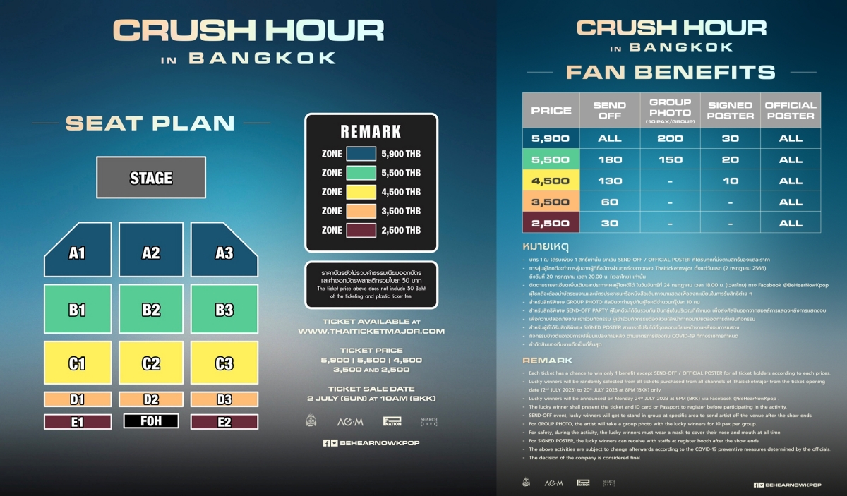 2023 CRUSH ASIA TOUR 'CRUSH HOUR' in BANGKOK พร้อมเปิดให้จองบัตรพร้อมกันทั่วประเทศ ในวันอาทิตย์ที่ 2 กรกฎาคม 2023 นี้ ตั้งแต่เวลา 10:00 น. เป็นต้นไป!! ทาง www.thaiticketmajor.com บัตรราคา 5,900 / 5,500 / 4,500 / 3,500 และ 2,500 บาท บัตรทุกราคามีสิทธิพิเศษให้ลุ้นมากมาย ทั้งได้ไปฟังเสียงสวรรค์ของ CRUSH และยังใกล้ชิดตัวจริงของของผู้ชายคนนี้อีกขนาดนี้ ต้องรีบกดบัตรให้ทันแล้ว ติดตามข่าวสารและข้อมูลเพิ่มเติม ได้ที่ Facebook: www.facebook.com/BeHearNowKpop และ Twitter: @behearnowkpop เชื่อว่าหากคุณได้ฟังเพลงของเขาซักครั้ง คุณจะไม่เสียใจที่คุณจะเป็นส่วนหนึ่งของคอนเสิร์ตในครั้งนี้แน่นอน